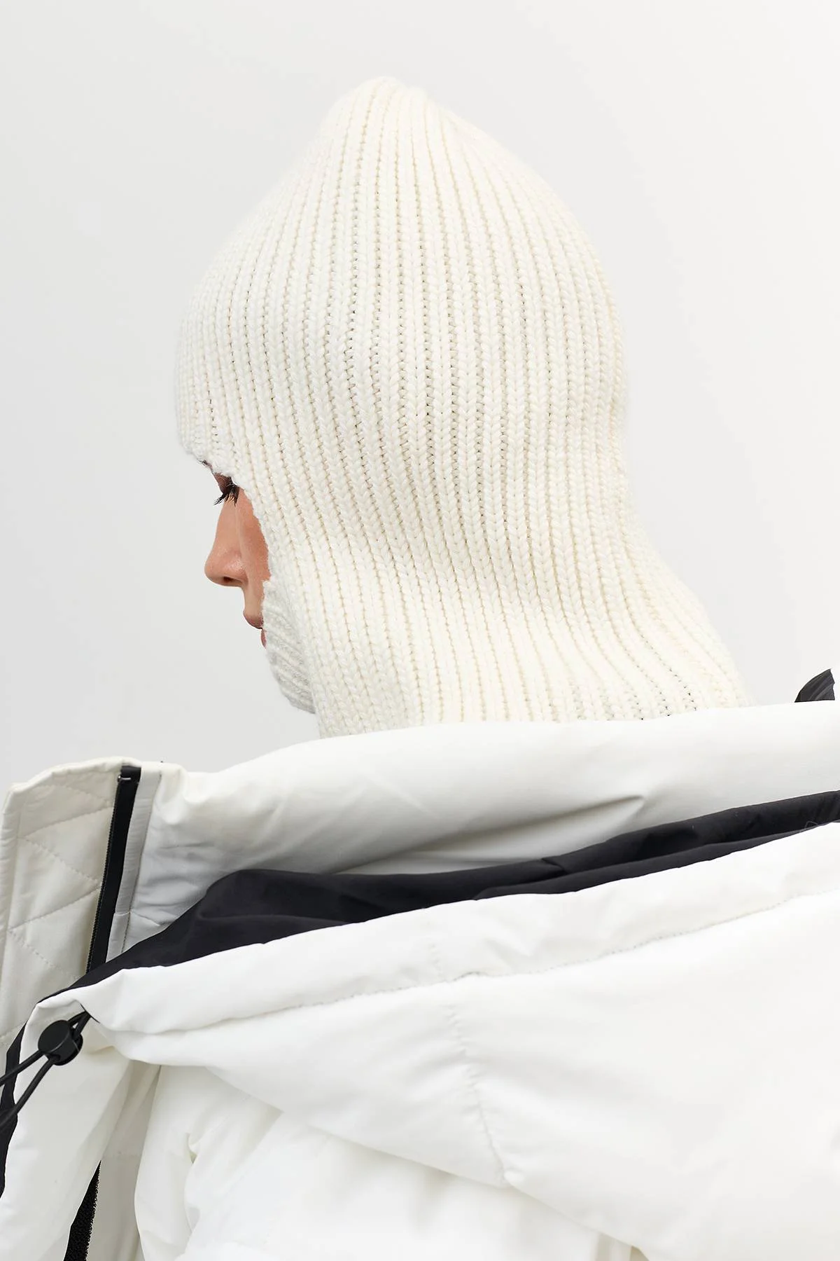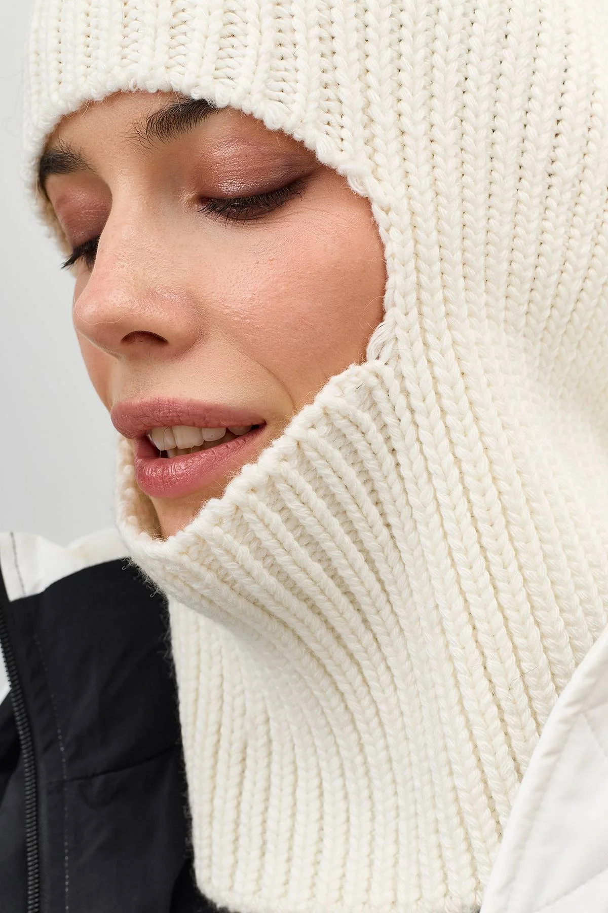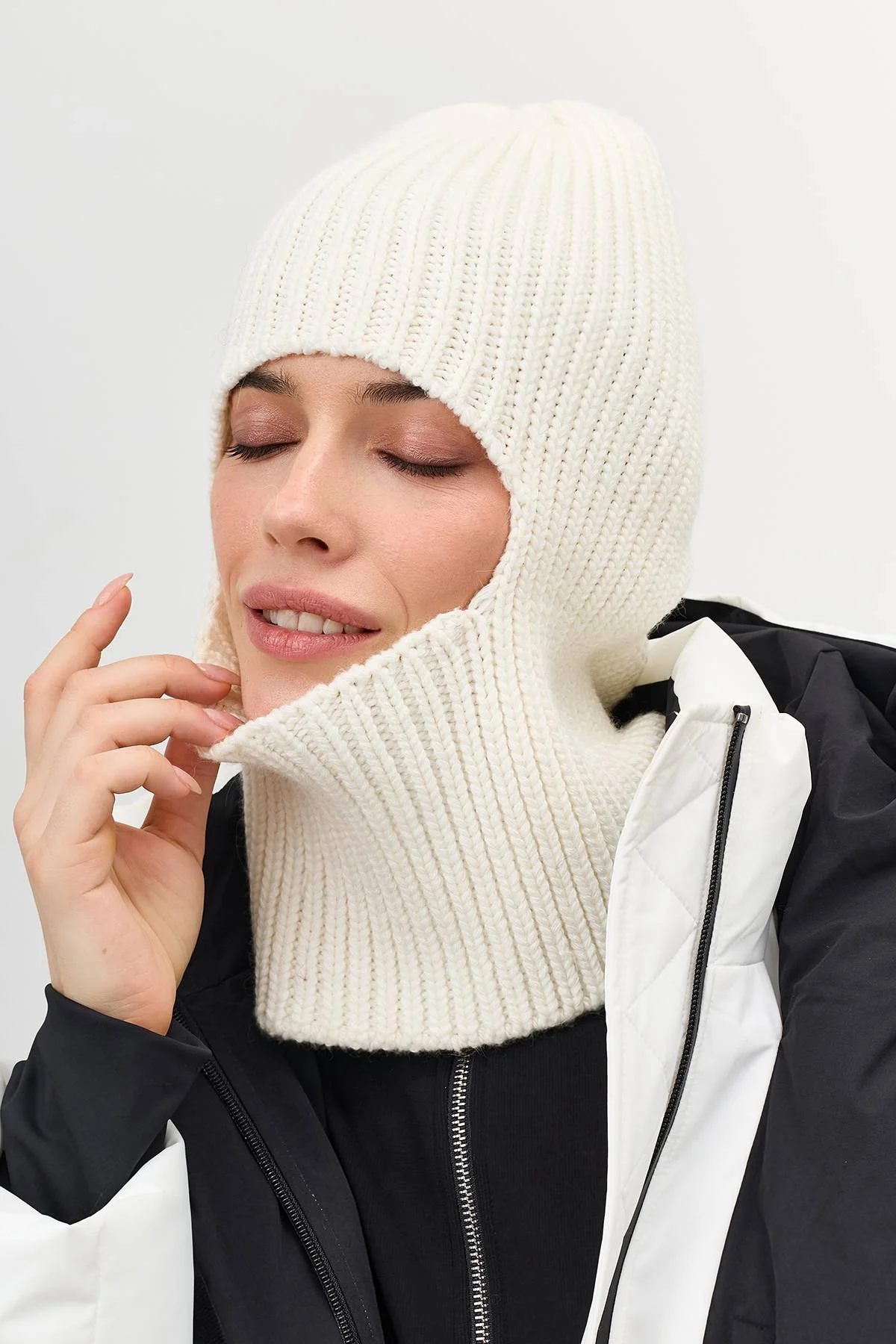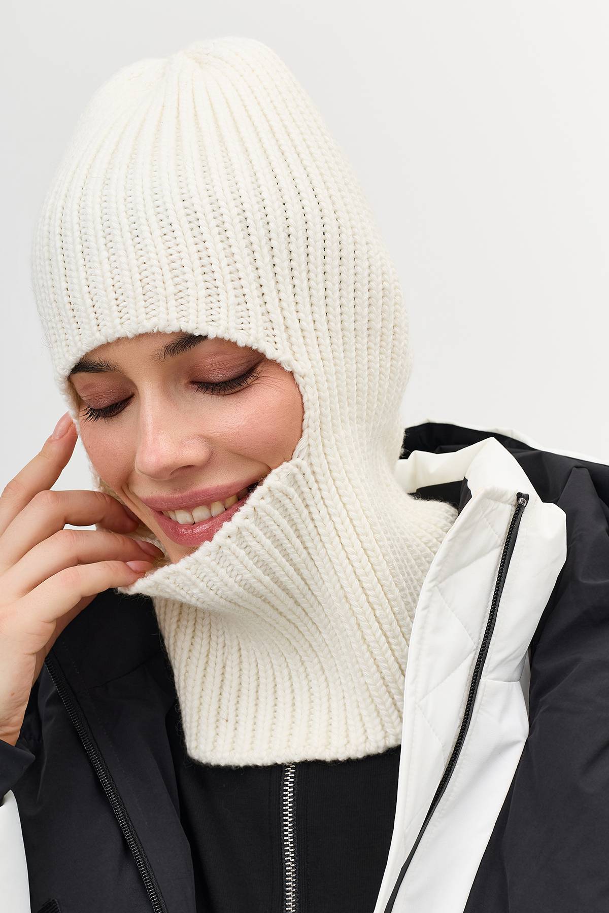 Вязаная балаклава в рубчик из вискозы и ангоры. Закругленные края вокруг выреза.