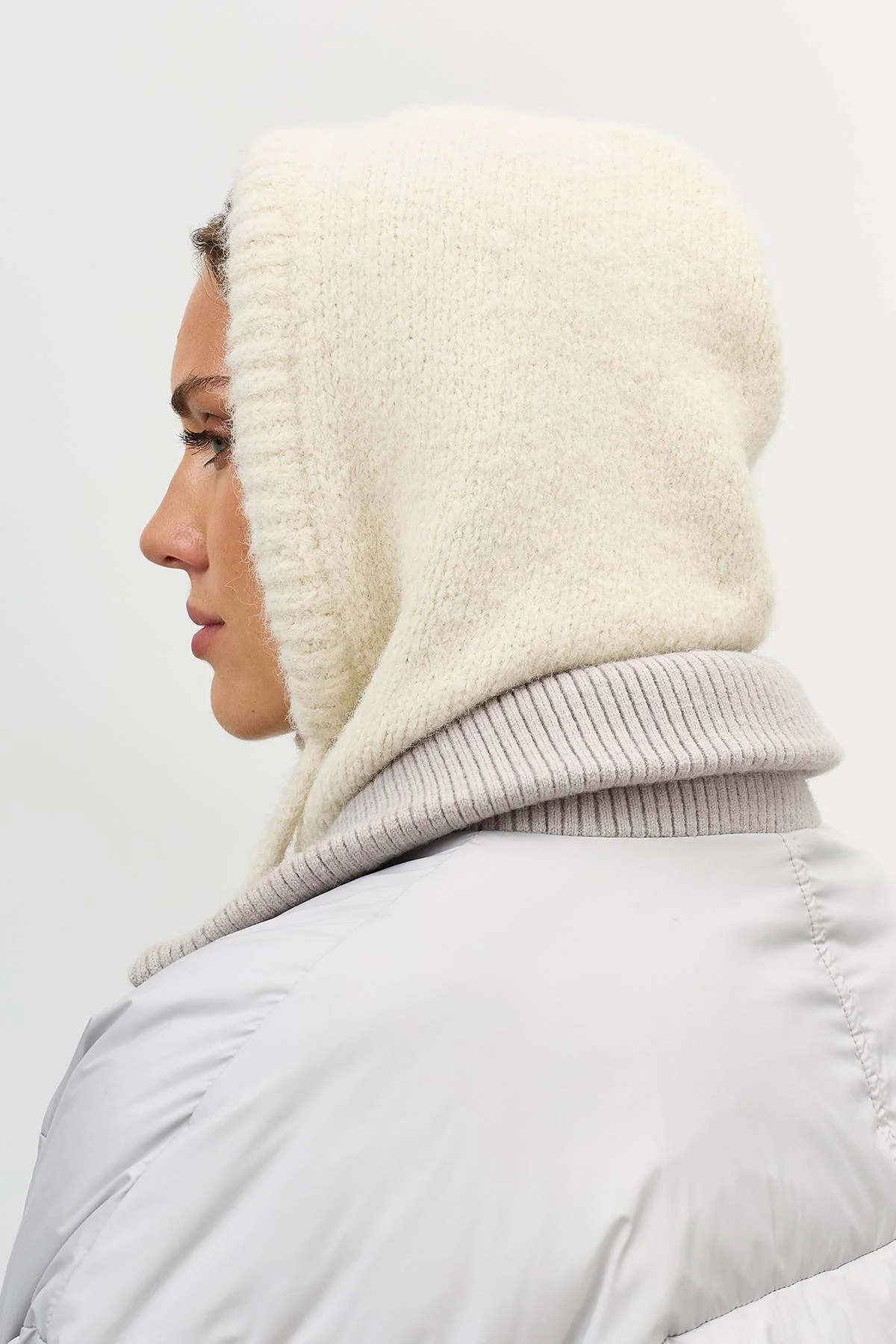 Капор в рубчик с шерстью в составе. Кулиса с тонким шнурком вокруг лица. Манжета по низу.