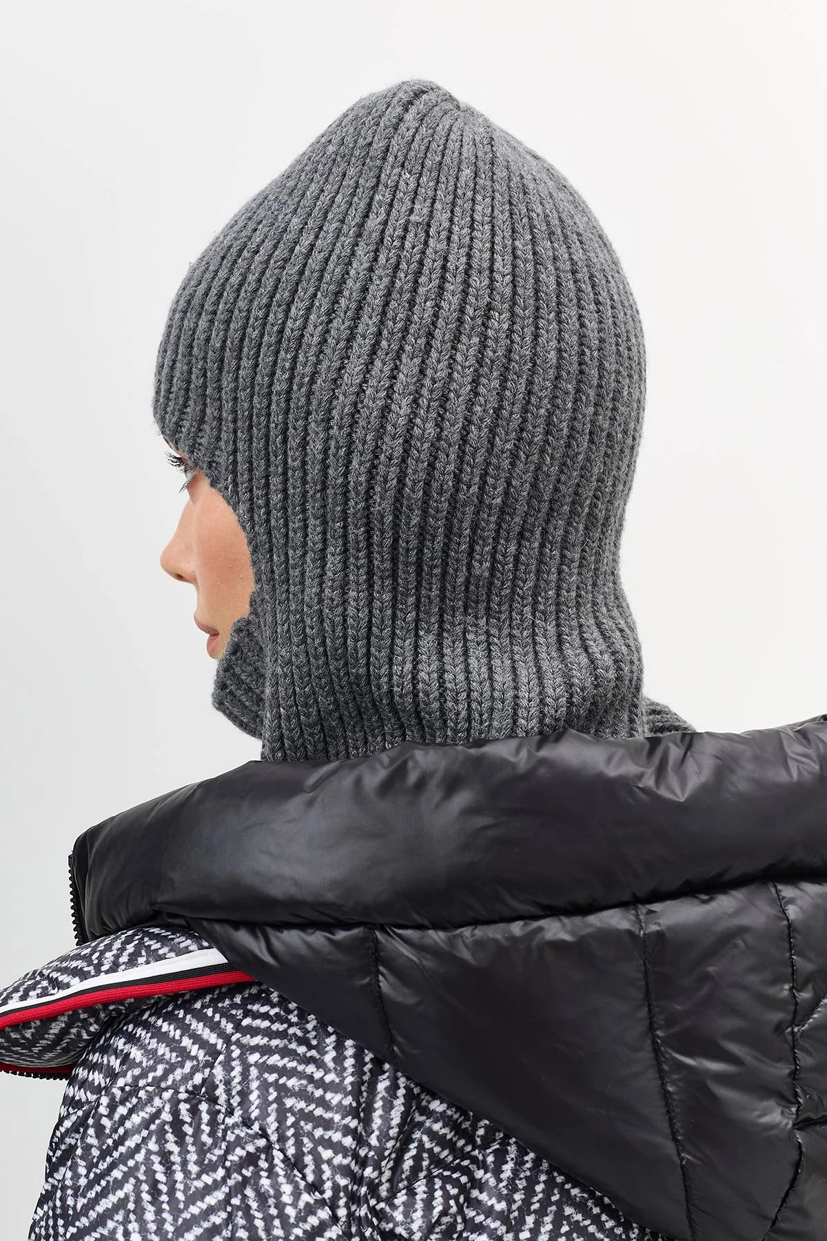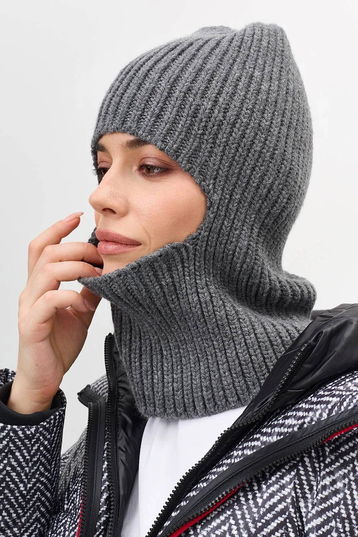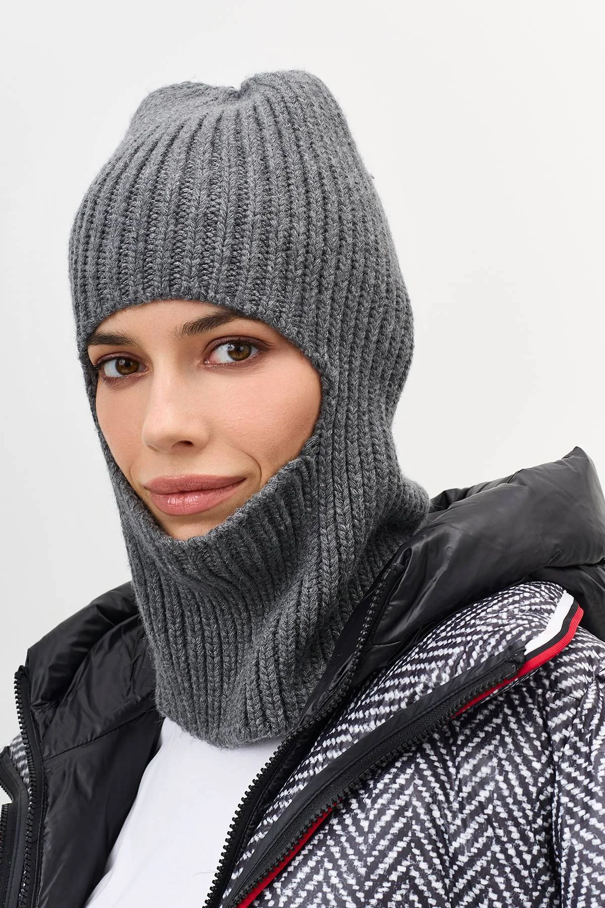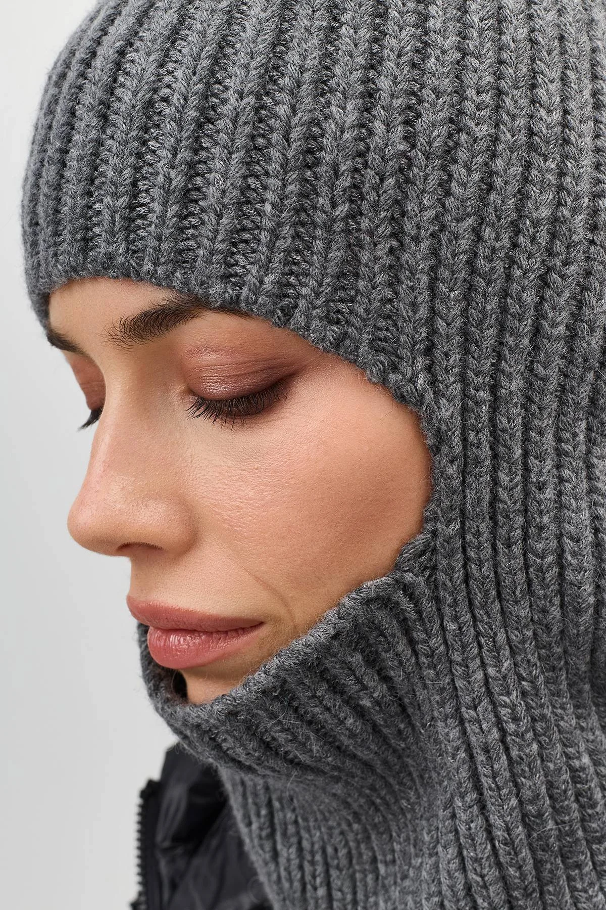 Вязаная балаклава в рубчик из вискозы и ангоры. Закругленные края вокруг выреза.