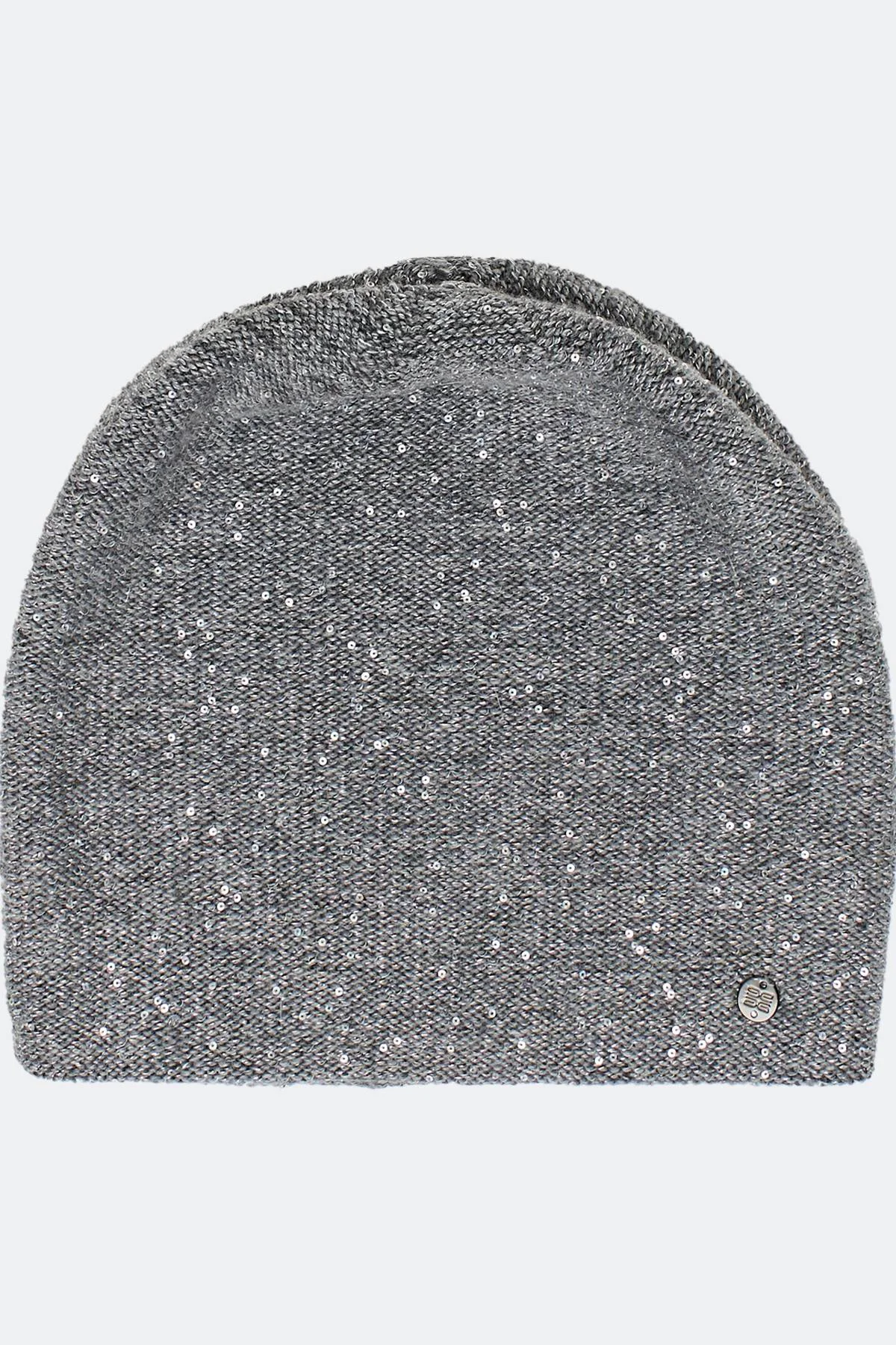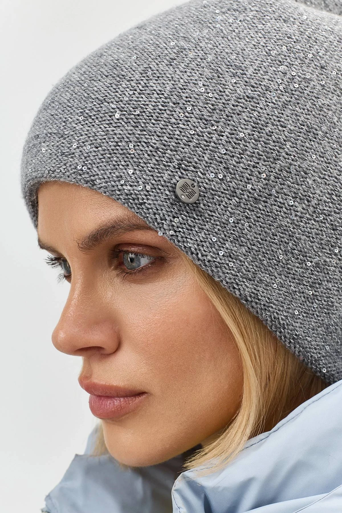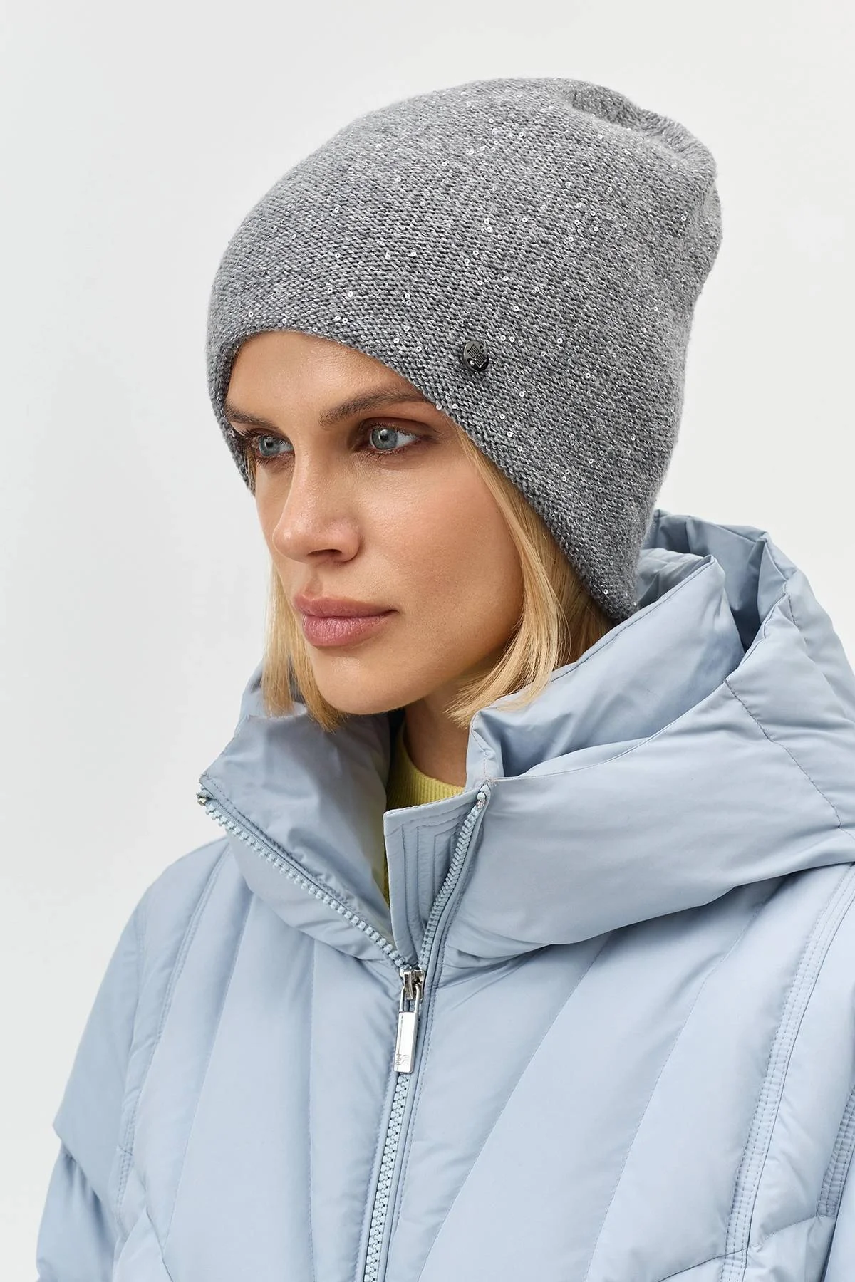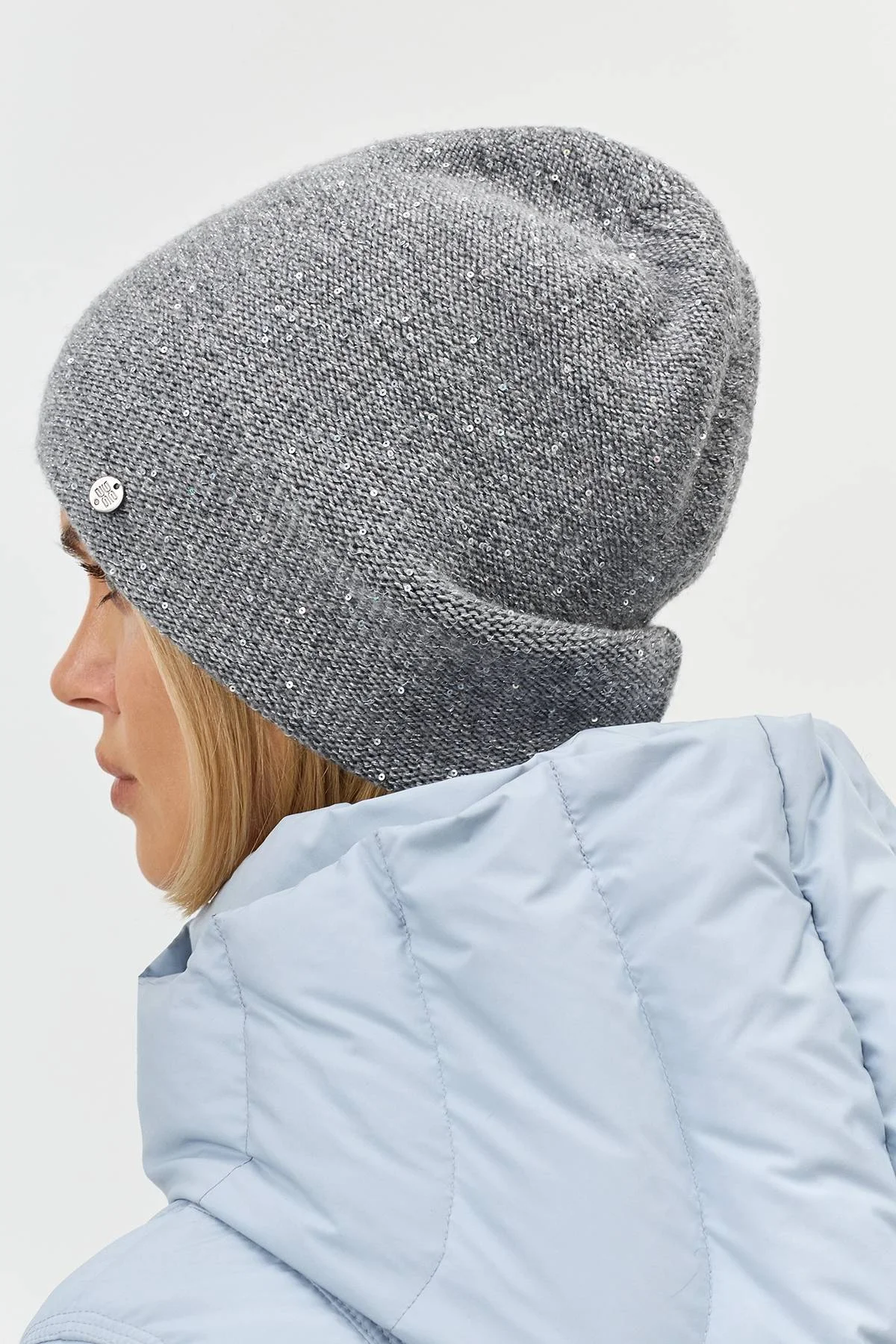 Шапка с деликатными пайетками и минималистичным металлическим брендированным шильдом. В составе ангора и шерсть.