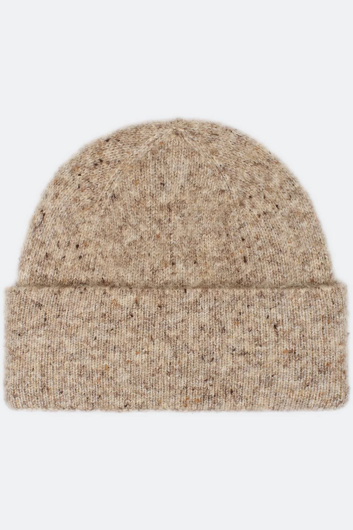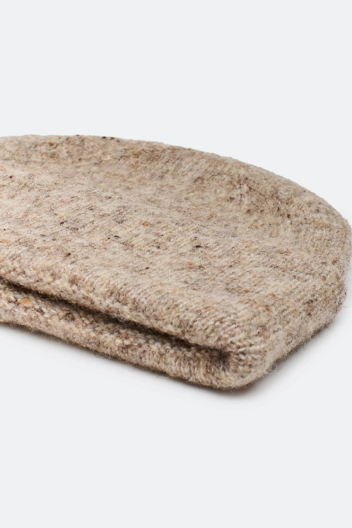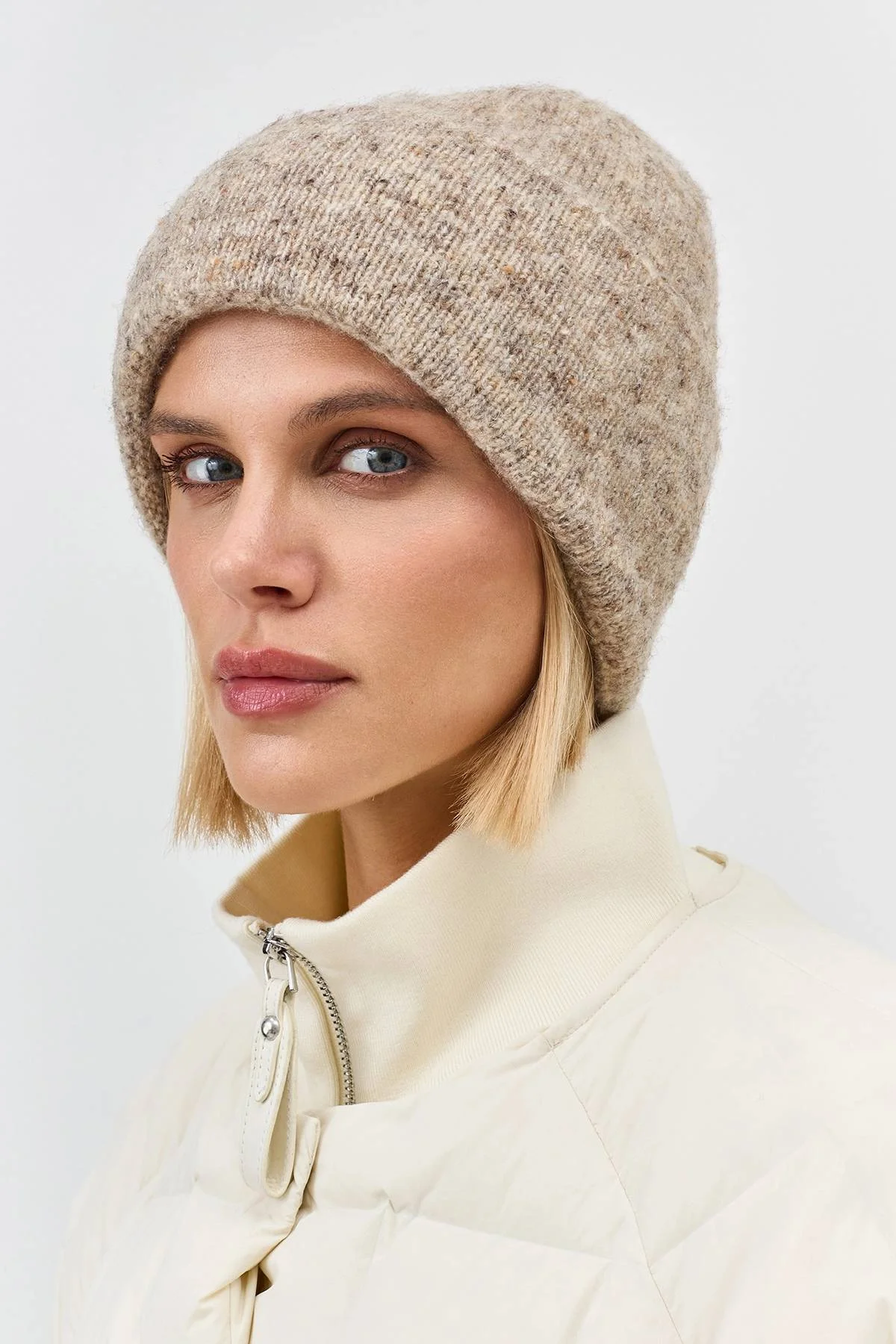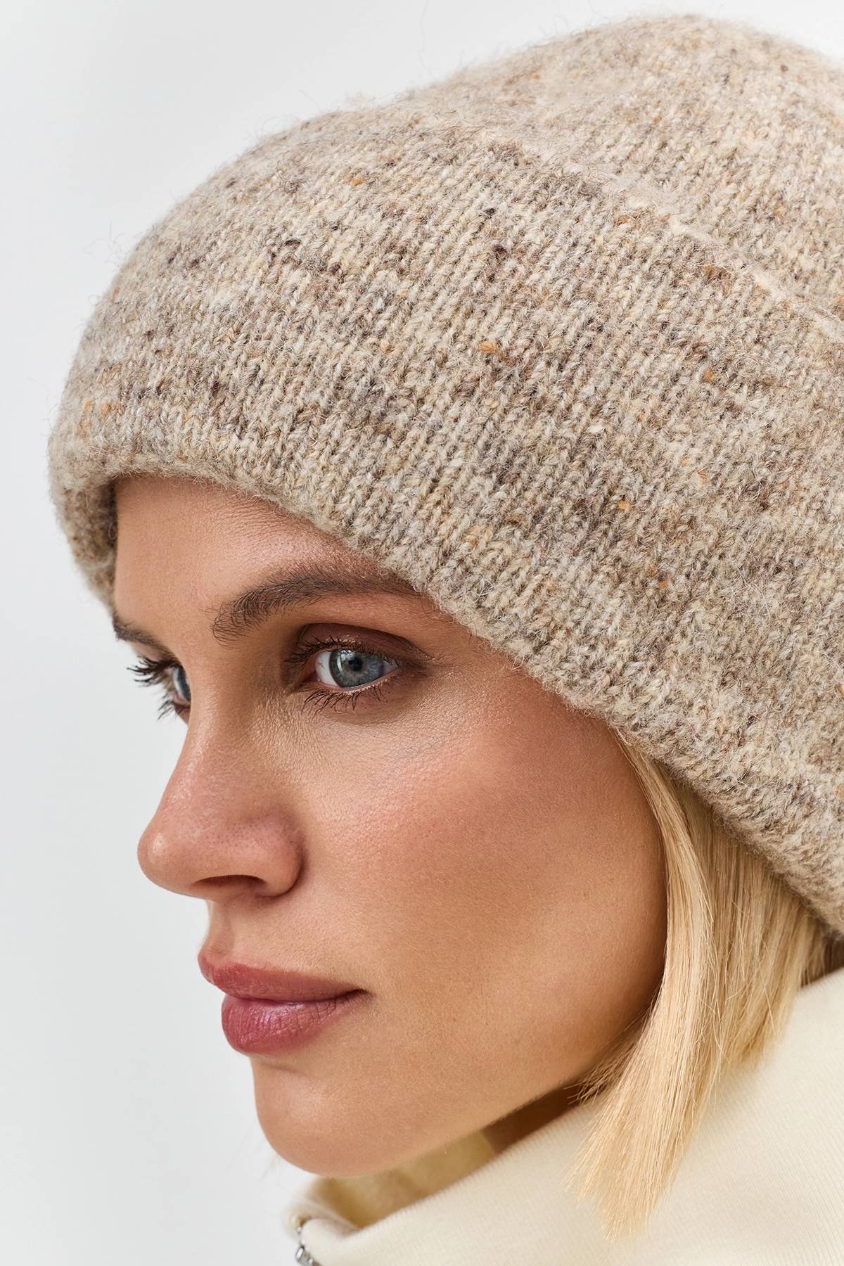 Укороченная шапка с шерстью в составе. Отделка в мелкий рубчик. Дополнена акцентным широким отворотом.