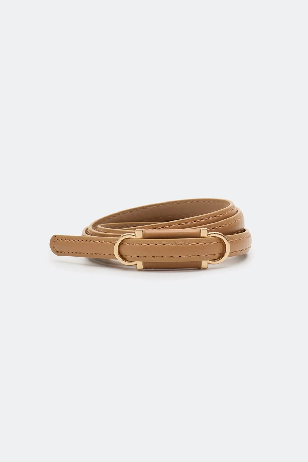Узкий ремень в бежевом цвете из искусственной кожи. Фактурная металлическая пряжка в форме комбинации полукругов. Данный аксессуар регулируется по размеру. Лаконичный дизайн ремня позволяет сочетать его с различными позициями гардероба.