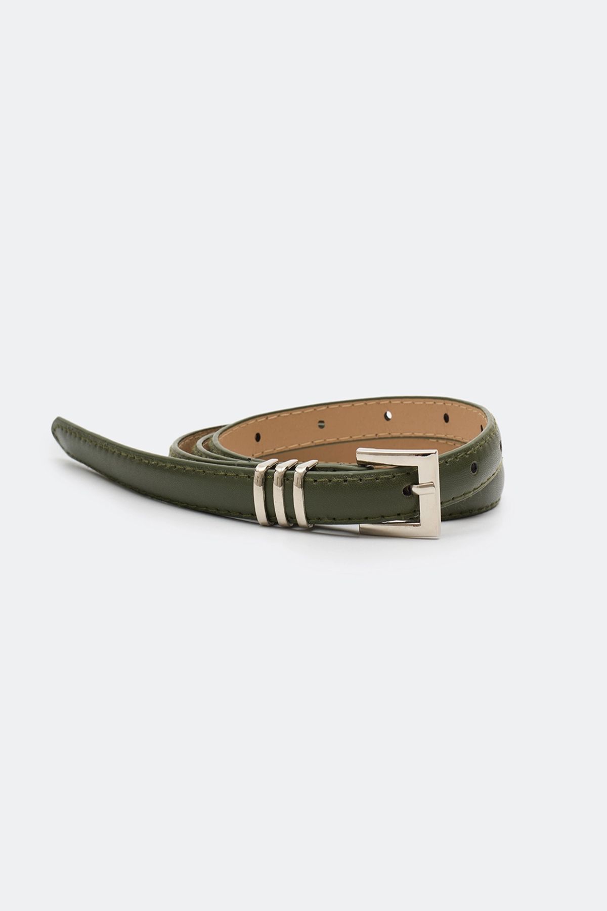 Узкий ремень в цвете хаки из искусственной кожи. Прямоугольная металлическая пряжка с острыми углами. Данный аксессуар регулируется по размеру. Лаконичный дизайн ремня позволяет сочетать его с различными позициями гардероба.