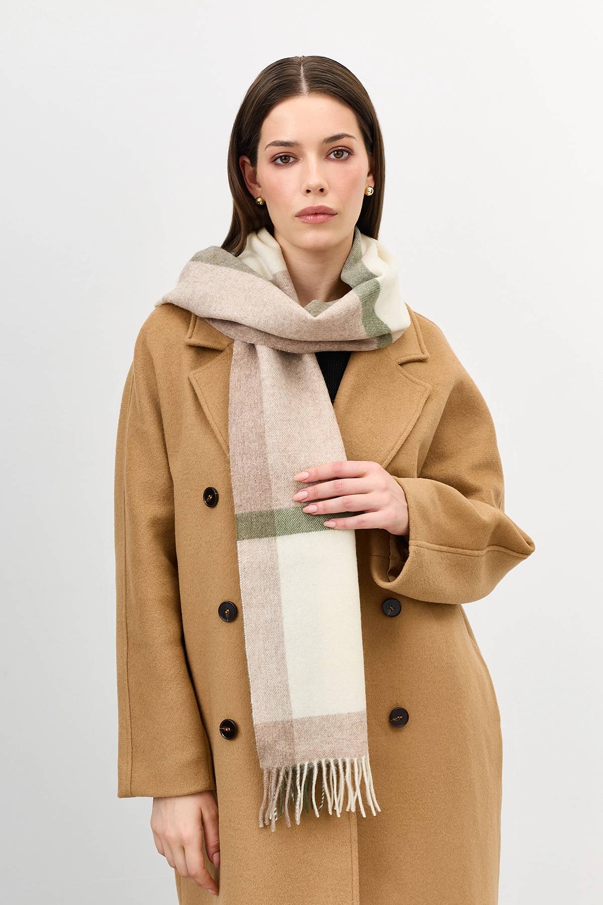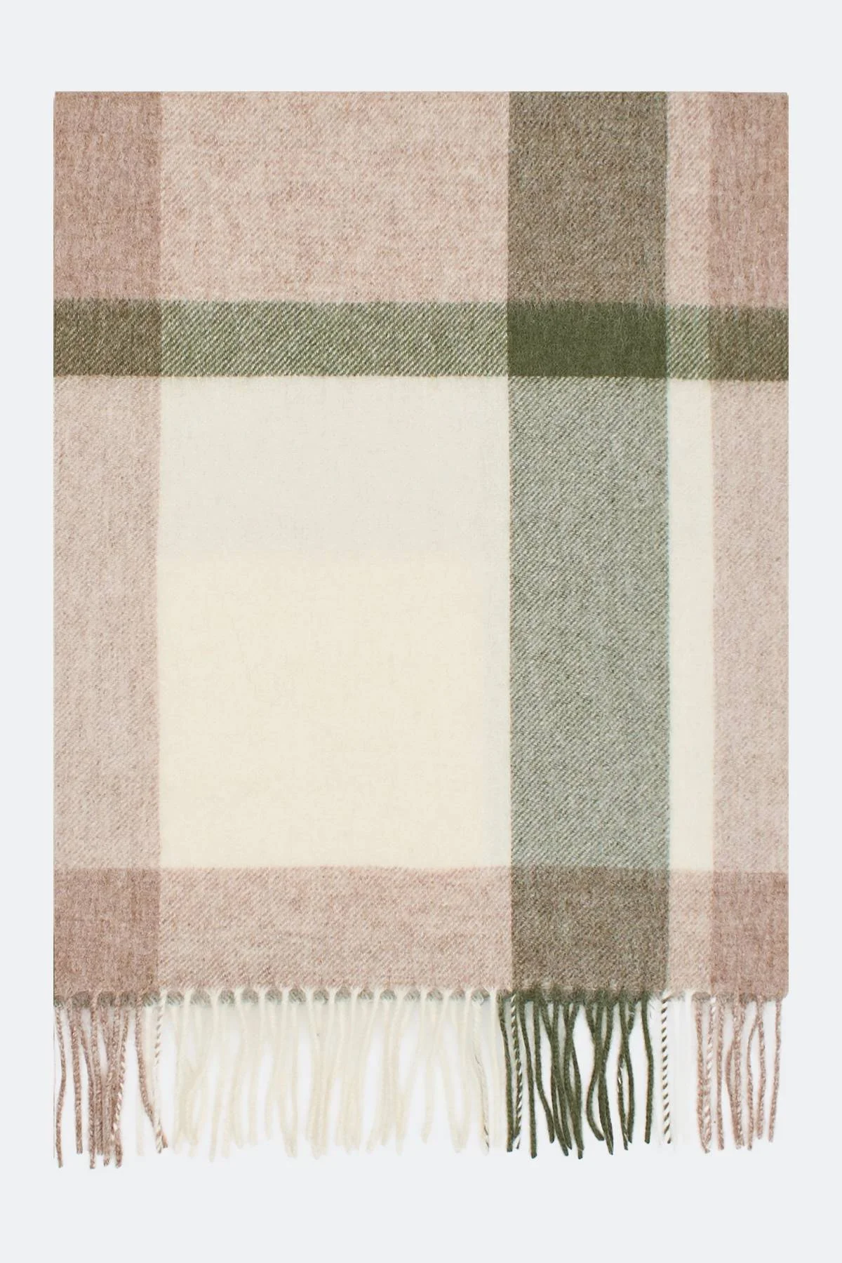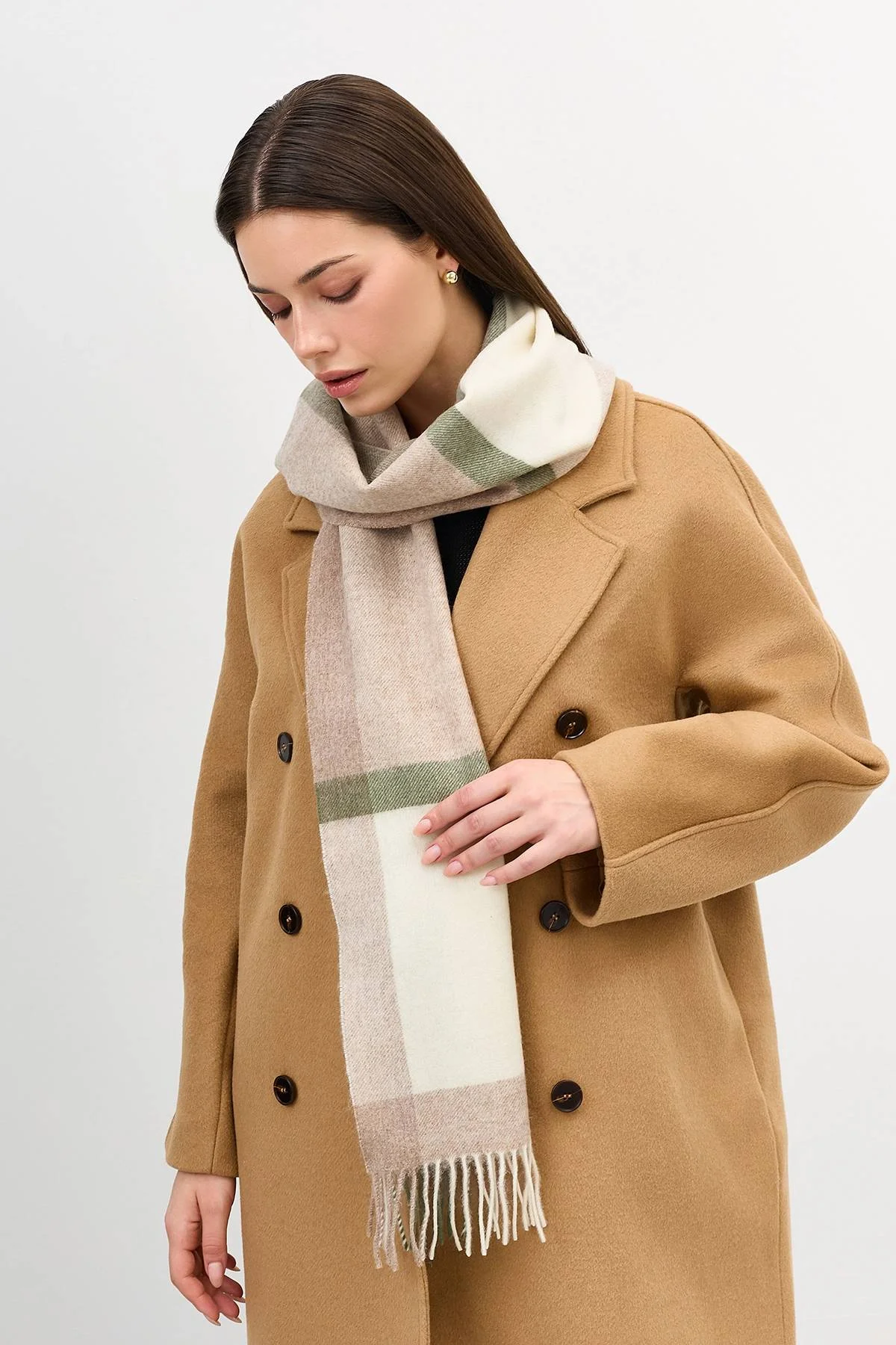 Шерстяной шарф в клетку с деликатной бахромой по краю. Прямоугольная форма, one size