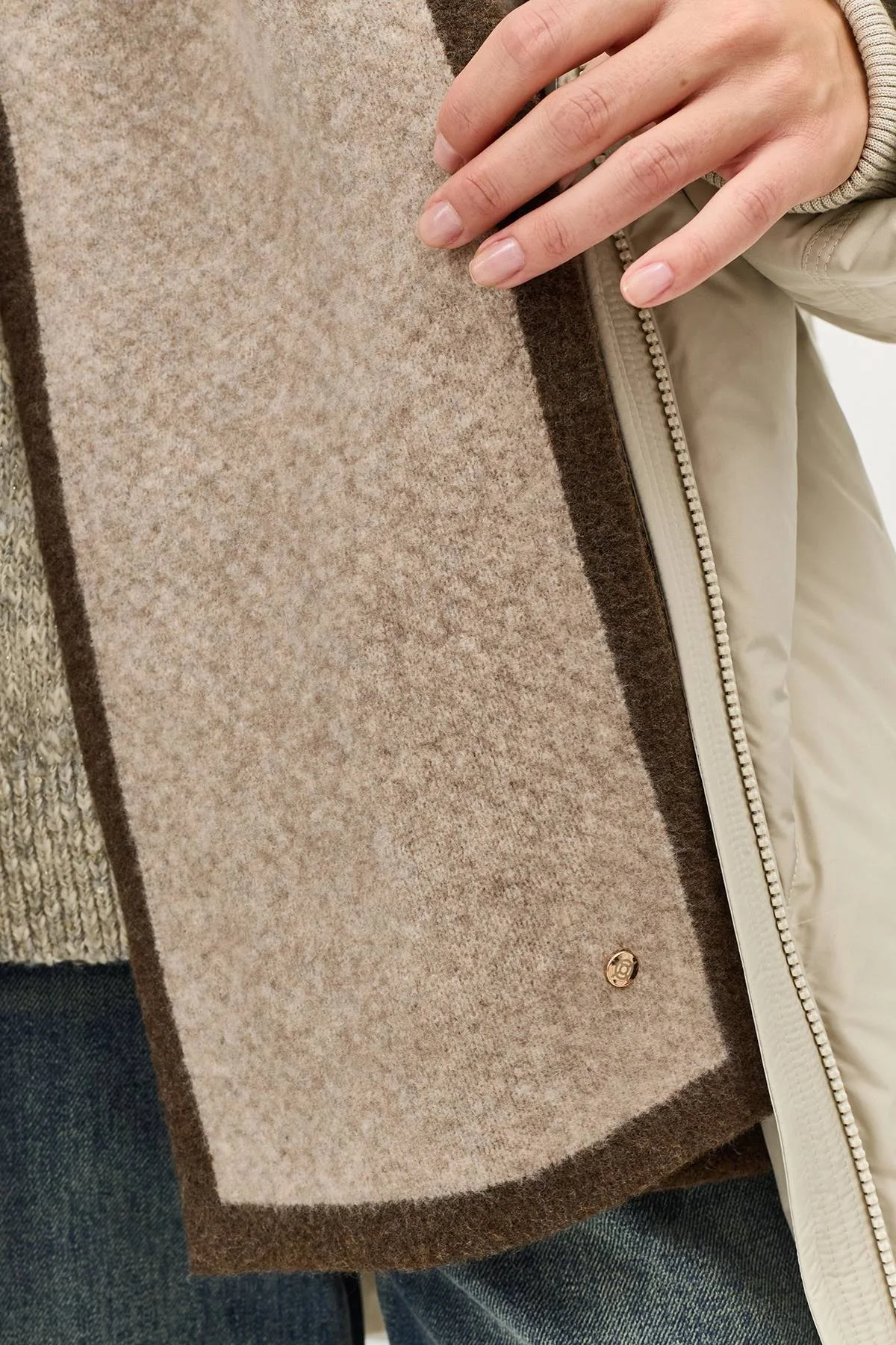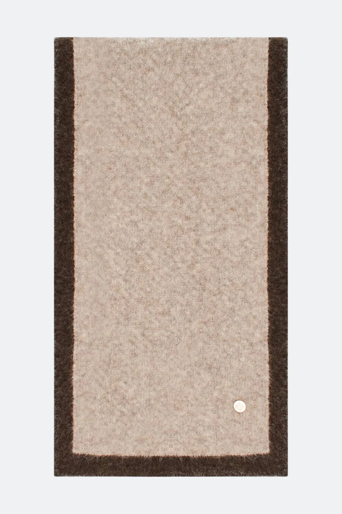 Вязаный двухцветный шарф из фасонной ворсистой пряжи с добавлением шерсти. Украшен металлическим шильдиком. Прямоугольная форма, one size