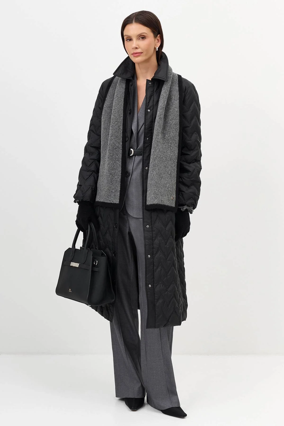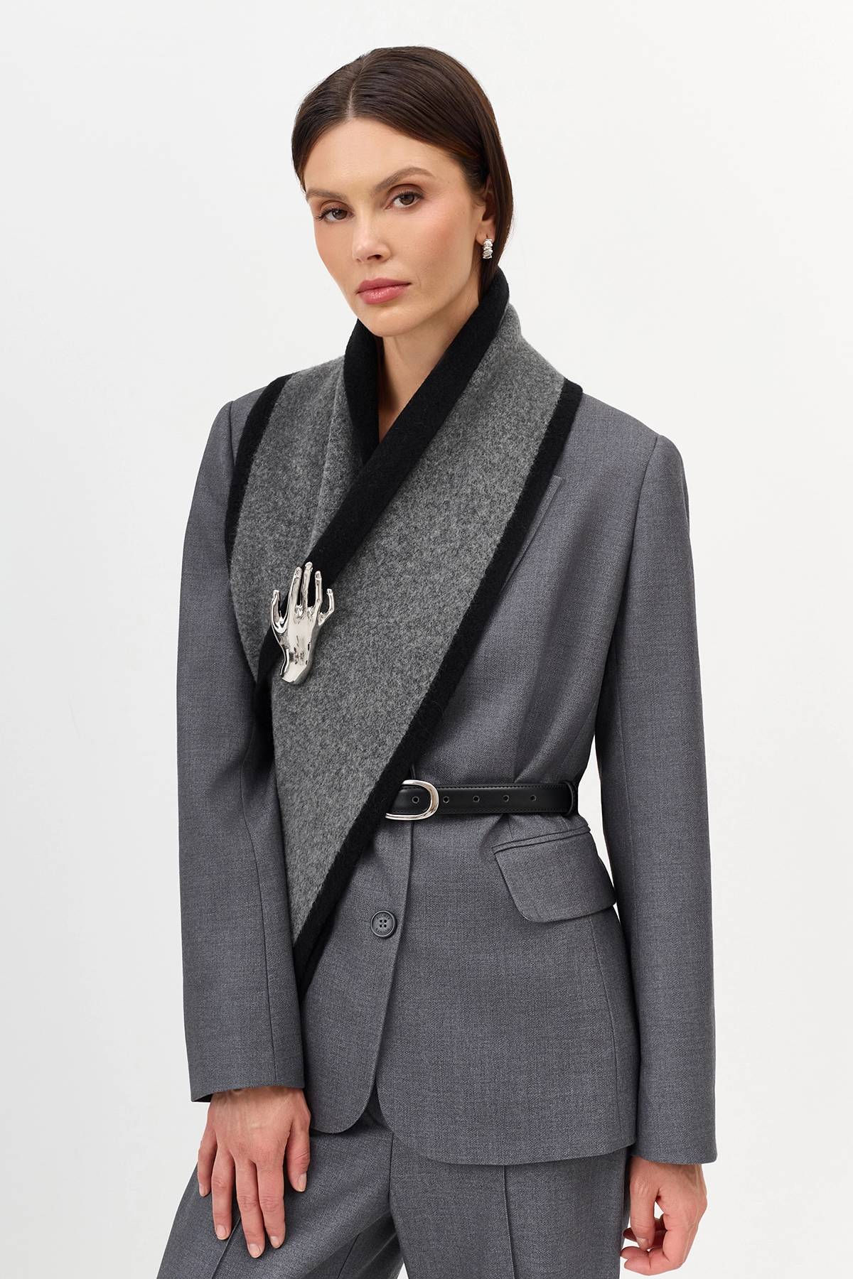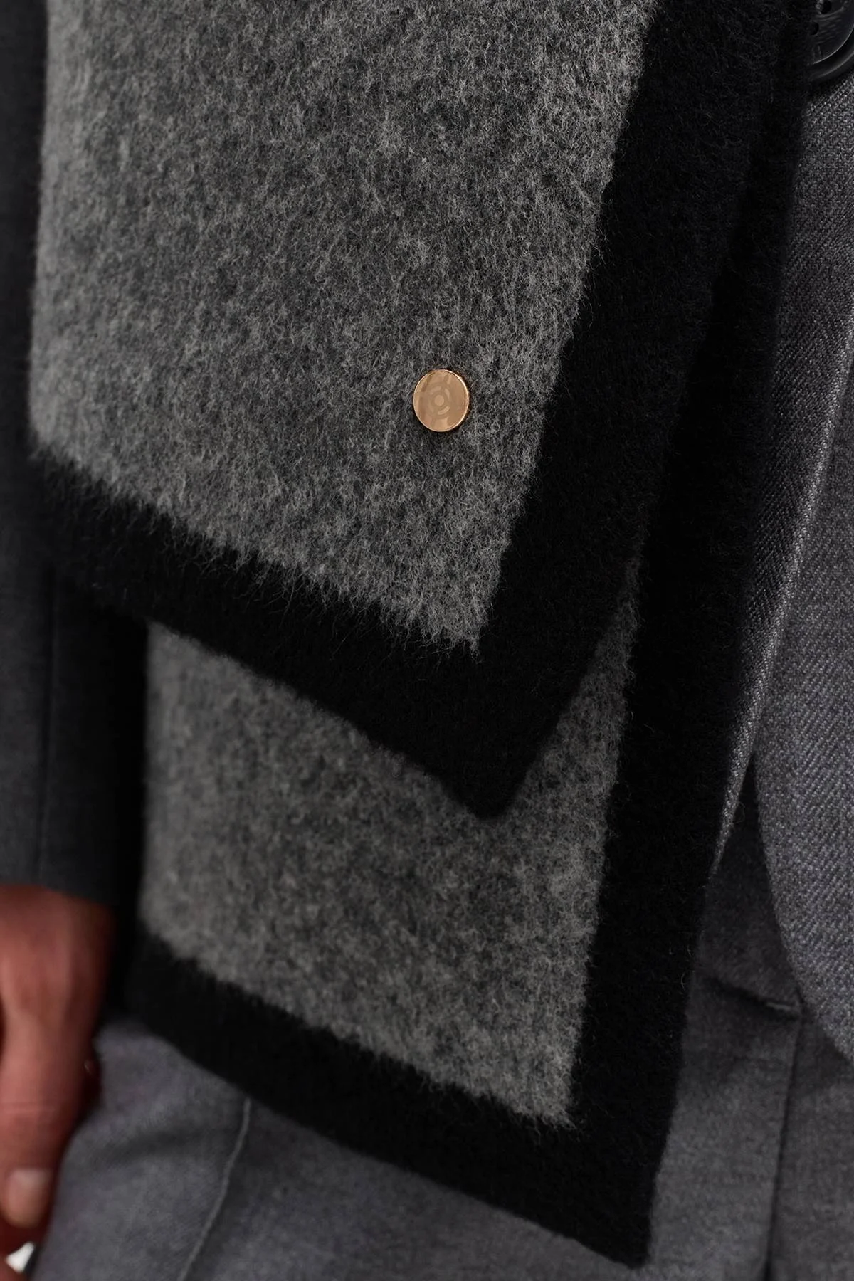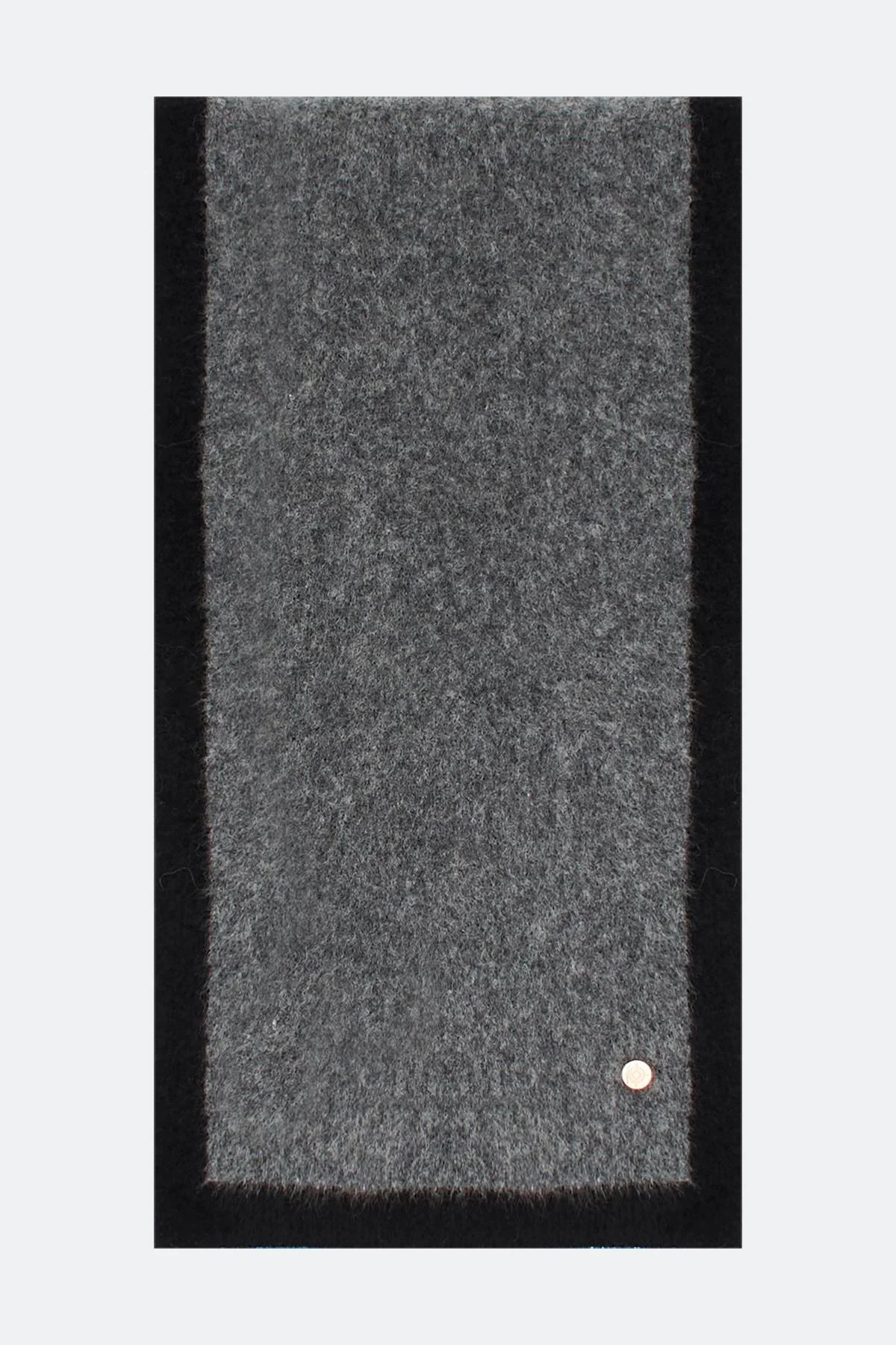 Вязаный двухцветный шарф из фасонной ворсистой пряжи с добавлением шерсти. Украшен металлическим шильдиком. Прямоугольная форма, one size