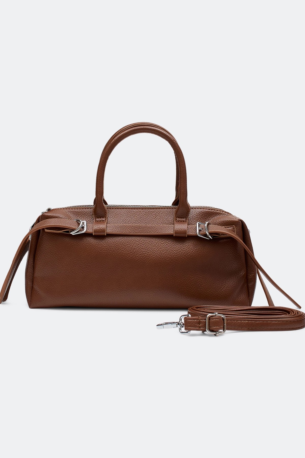 Сумка-багет из мягкой эко кожи коричневого цвета. Мягкая форма, две короткие ручки и длинный регулируемый ремешок в комплекте. Застёжка на молнию. Подкладка из 100% полиэстера.