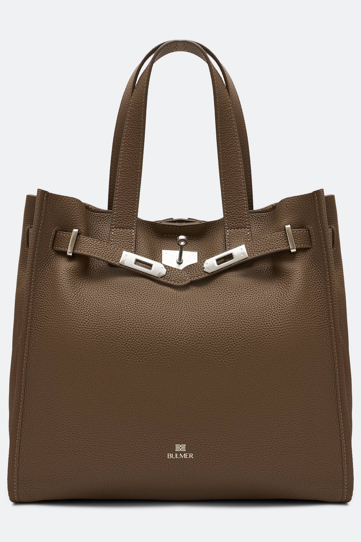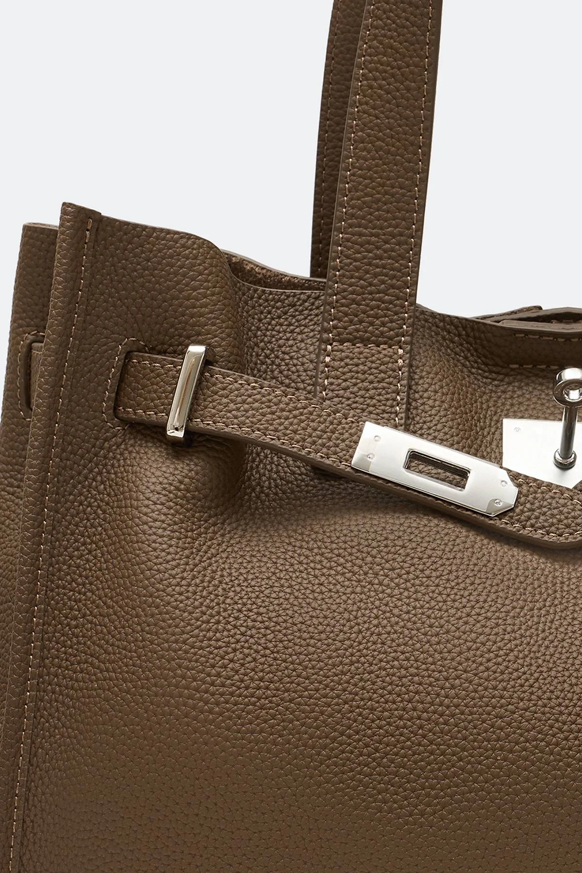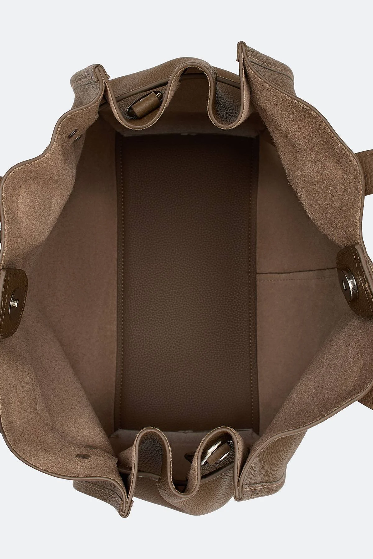 Мягкая фактурная кожа и выразительный хлястик с поворотным механизмом создают элегантный образ. Вместительное отделение с внутренним текстильным мешком обеспечивает практичность и функциональность. Двойные ручки и регулируемый ремешок предлагают разнообразные варианты ношения.