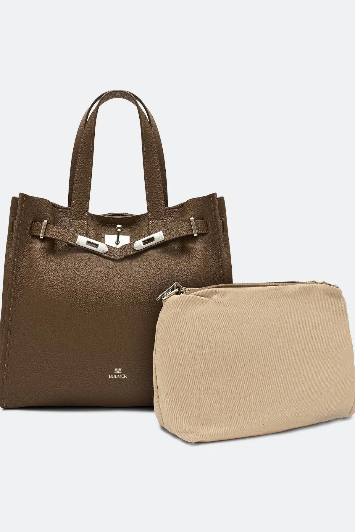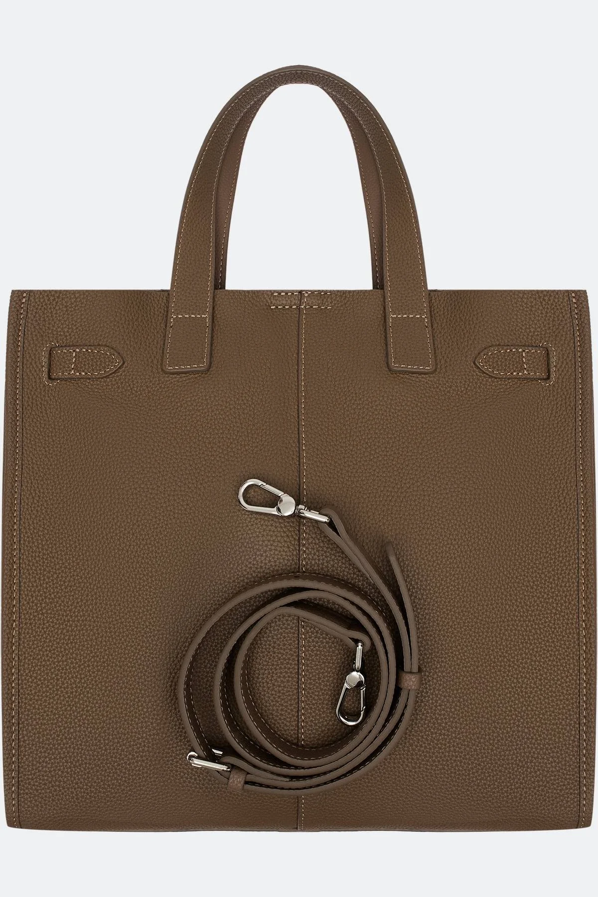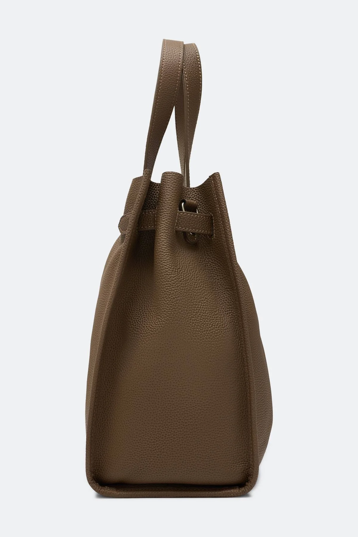 Мягкая фактурная кожа и выразительный хлястик с поворотным механизмом создают элегантный образ. Вместительное отделение с внутренним текстильным мешком обеспечивает практичность и функциональность. Двойные ручки и регулируемый ремешок предлагают разнообразные варианты ношения.