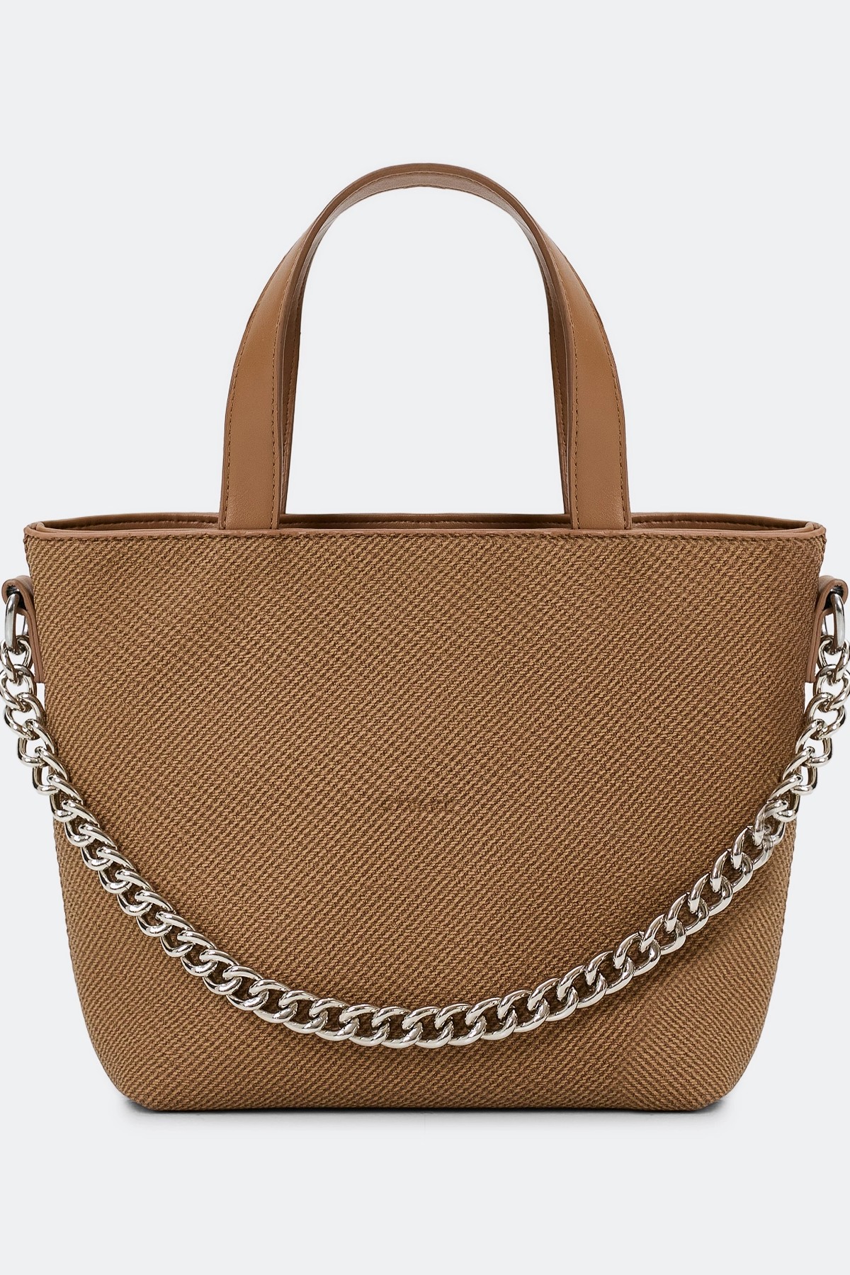 Сумка из фактурной эко кожи коричневого цвета с мягкой формой. Две короткие ручки и длинный ремешок в комплекте. Одно основное отделение и внутренний карман. Застёжка на молнию. Дополнена акцентной цепочкой и платком с анималистичным принтом. Подкладка из 100% полиэстера.