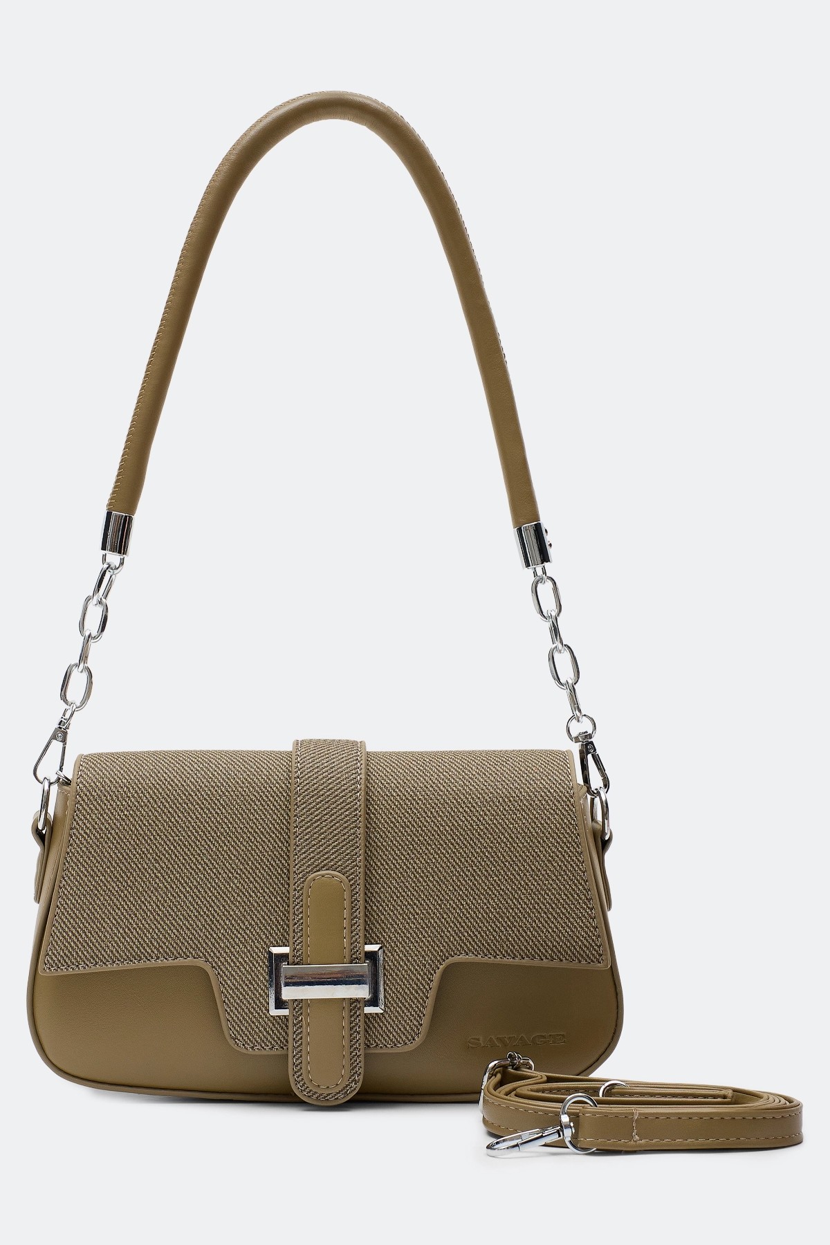 Оливковая сумка кроссбоди с клапаном из фактурной эко кожи. Одно вместительное отделение. Застежка на клапан и кнопку. Один съемный короткий ремешок с акцентной цепочкой и длинный регулируемый ремешок в комплекте. Подкладка из 100% полиэстера.