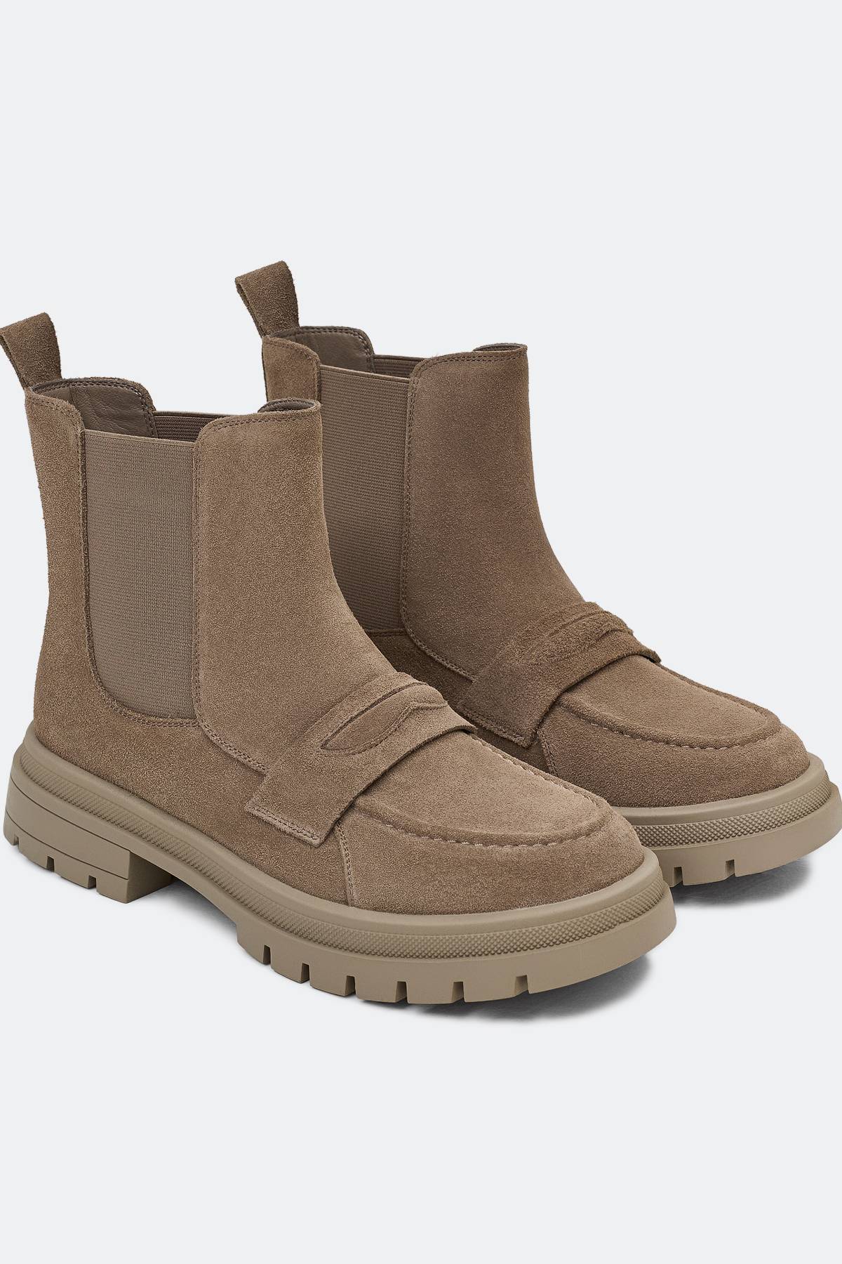 Ботинки челси из натуральной замши на высокой рифленой подошве. Эластичные вставки для удобства надевания. Декоративный хлястик с прорезью. Закругленный мыс. Подкладка и стелька из теплого текстиля. Рифленая подошва из термопластичной резины.