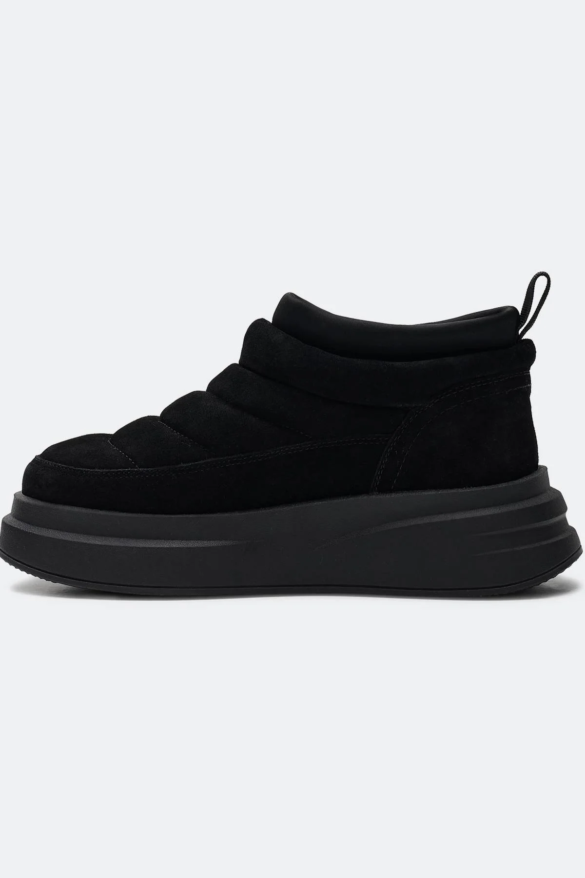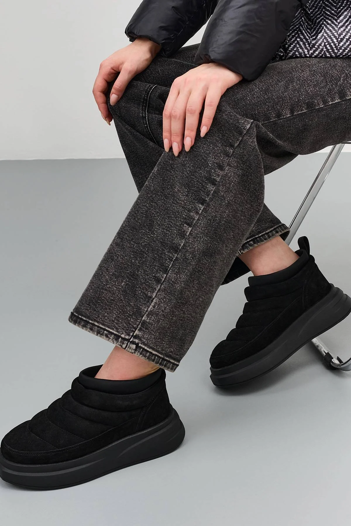 Комбинированные полуботинки из натуральной замши с текстильным мягким кантом. Закругленный мыс. Подкладка и стелька из шерстяного меха. Высокая подошва из термопластичной резины.