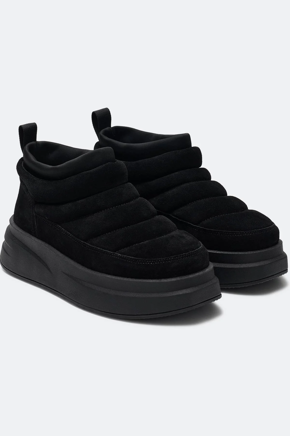 Комбинированные полуботинки из натуральной замши с текстильным мягким кантом. Закругленный мыс. Подкладка и стелька из шерстяного меха. Высокая подошва из термопластичной резины.