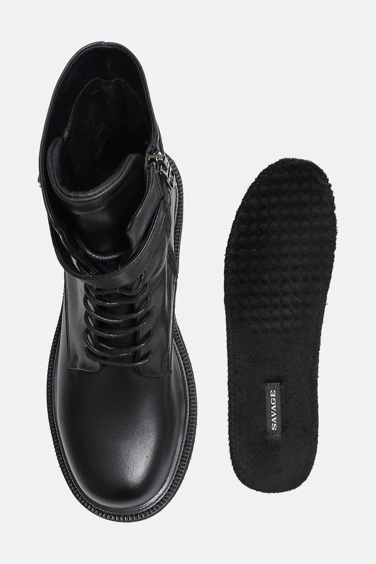Кожаные высокие ботинки с акцентным ремешком и шнуровкой. Закругленный мыс. Застежка на молнию с внутренней стороны. Подкладка и стелька из теплого текстиля. Объемная подошва с рифленым протектором и блочным каблуком из термопластичной резины.