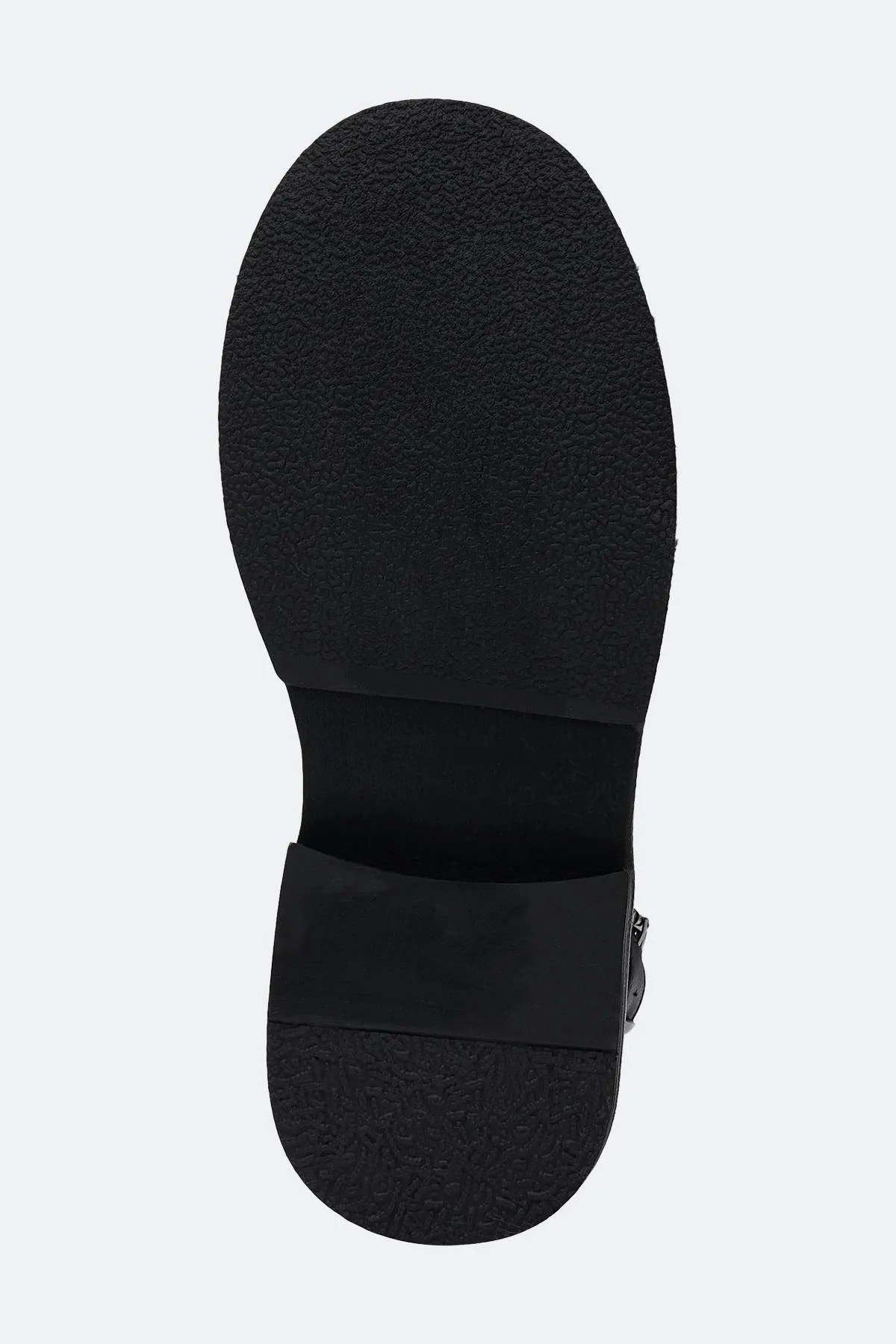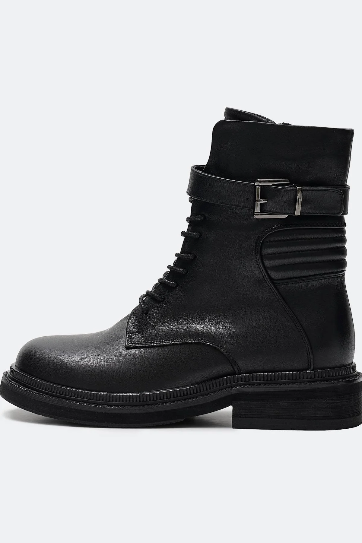 Кожаные высокие ботинки с акцентным ремешком и шнуровкой. Закругленный мыс. Застежка на молнию с внутренней стороны. Подкладка и стелька из теплого текстиля. Объемная подошва с рифленым протектором и блочным каблуком из термопластичной резины.