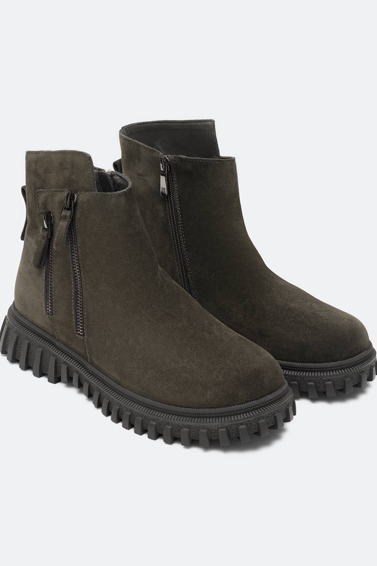Полуботинки из натуральной замши на высокой рифленой подошве. Застежка на молнию с внутренней стороны. Декоративные молнии с внешней стороны. Закругленный мыс. Подкладка и стелька из натуральной шерсти. Рифленая подошва из термопластичной резины.