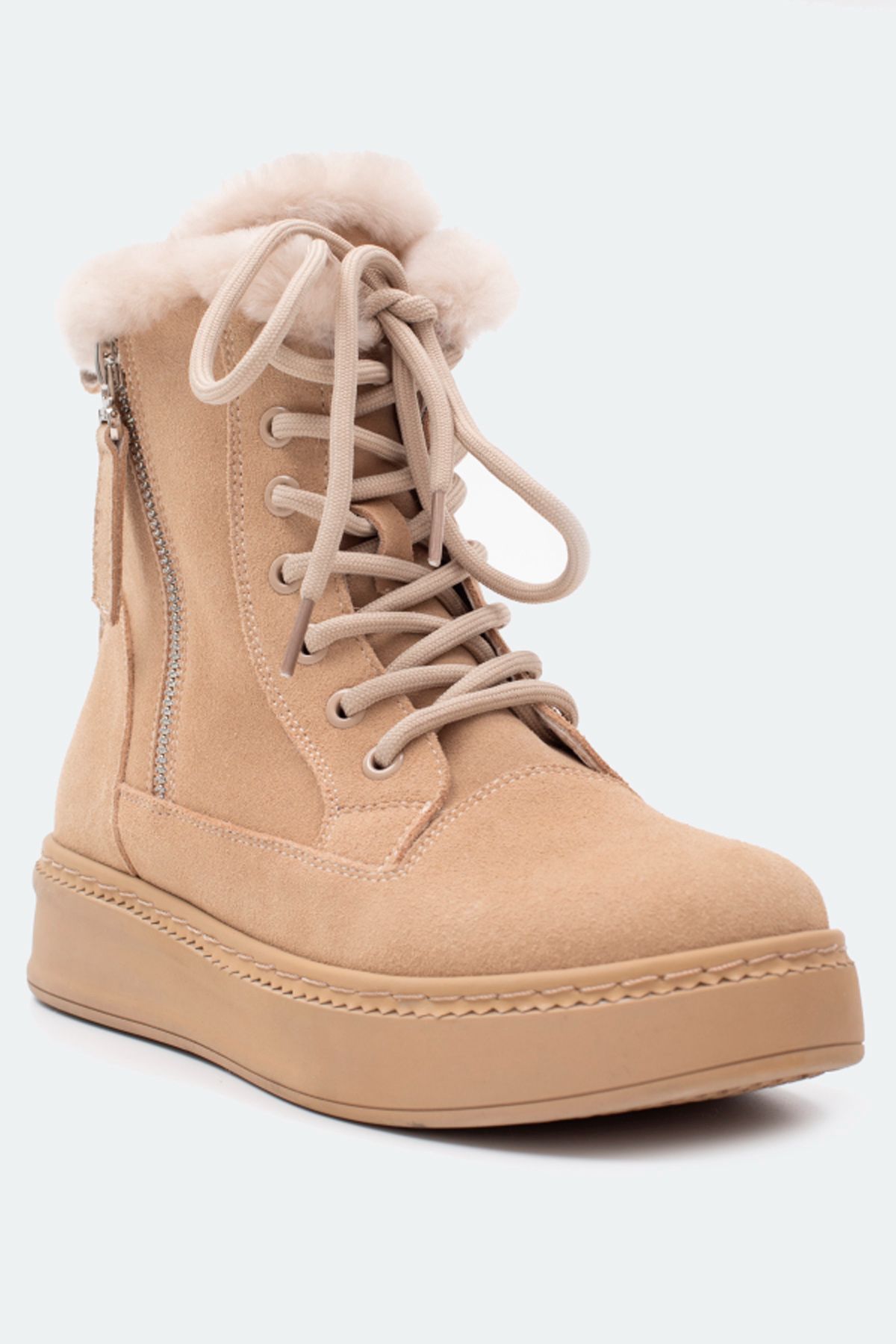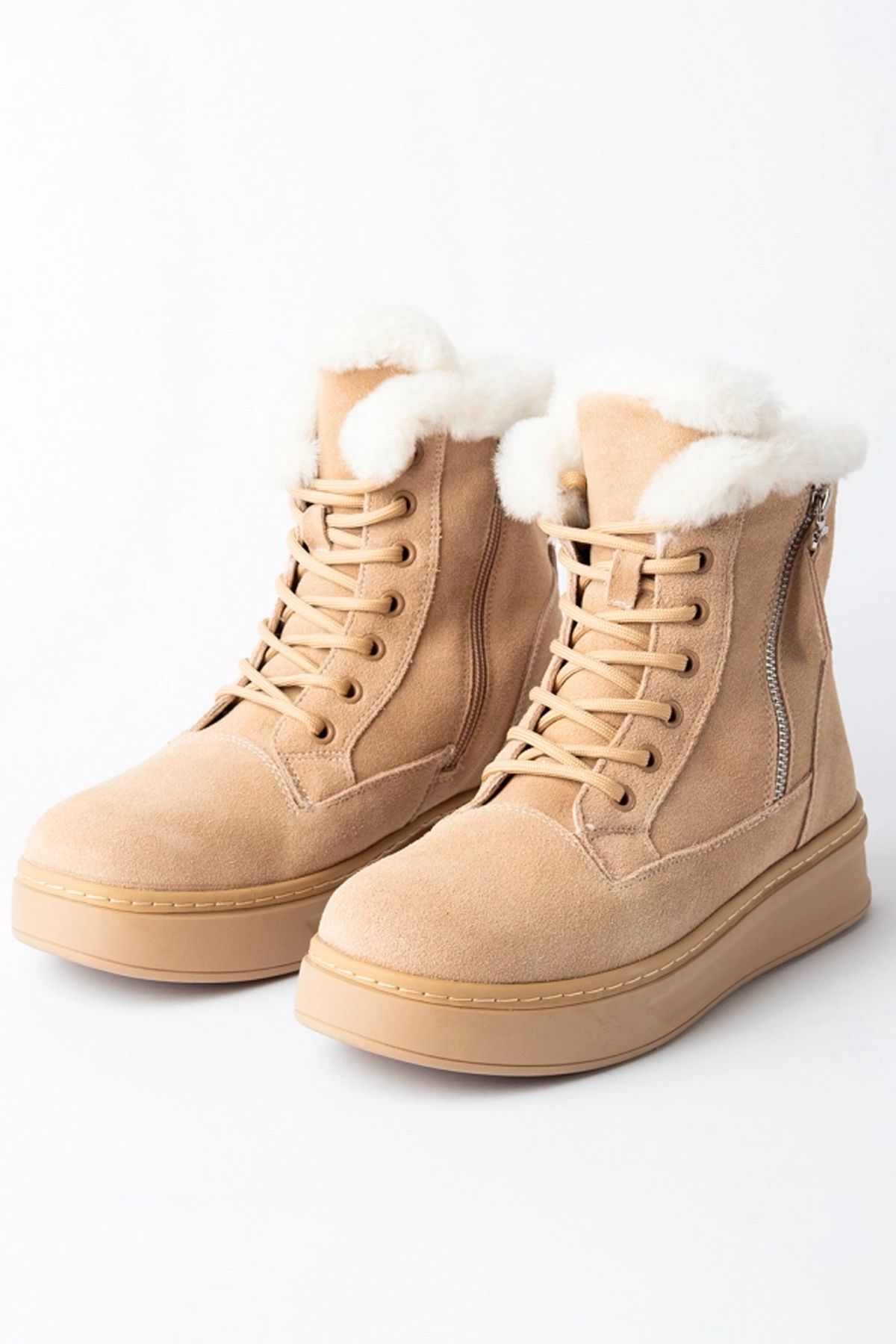 Утепленные ботинки из натуральной замши. Подкладка выполнена из натуральной шерсти. Искусственный мех по краю. Закругленный мыс. Застежка молния с внутренней стороны обеспечивает удобное надевание и снятие ботинок. Шнуровка гармонично сочетается с искусственным мехом. Данная модель отлично подойдёт для повседневных образов.