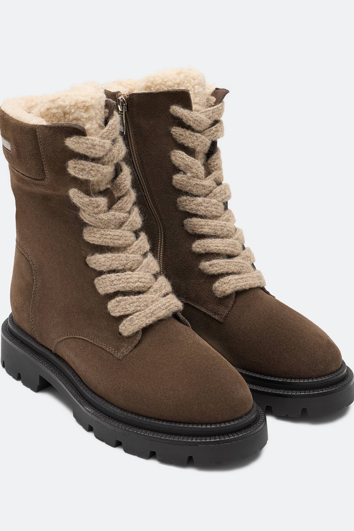 Ботинки из натуральной замши с объёмными шнурками. Закругленный мыс. Застёжка на молнию с внутренней стороны. Отделка из нескольких цепочек металлической монили. Подкладка и стелька из искусственного меха. Высокая рифленая подошва и каблук из термопластичной резины.