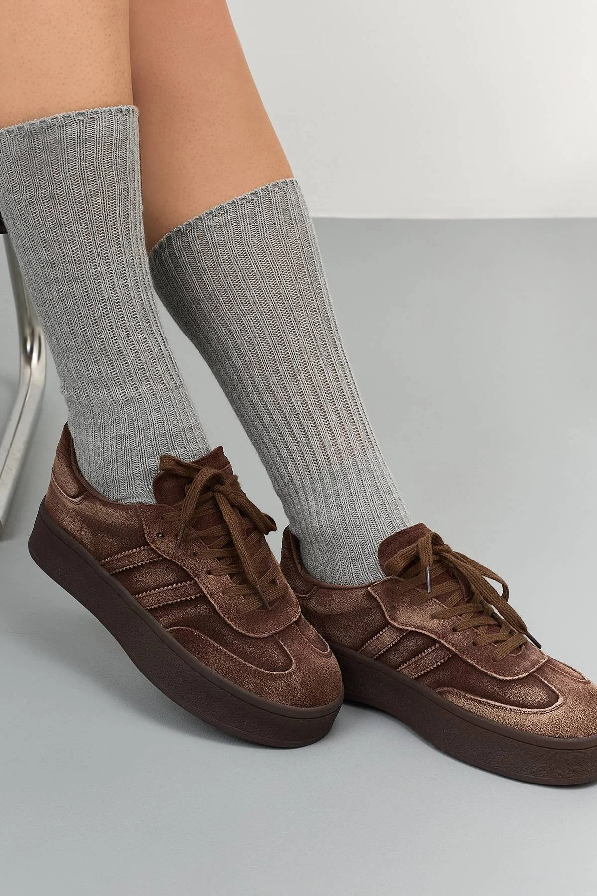 Кеды из натуральной замши. Закругленный мыс. Фиксация на шнурки. Подкладка и стелька из текстиля. Высокая подошва из термопластичной резины.
