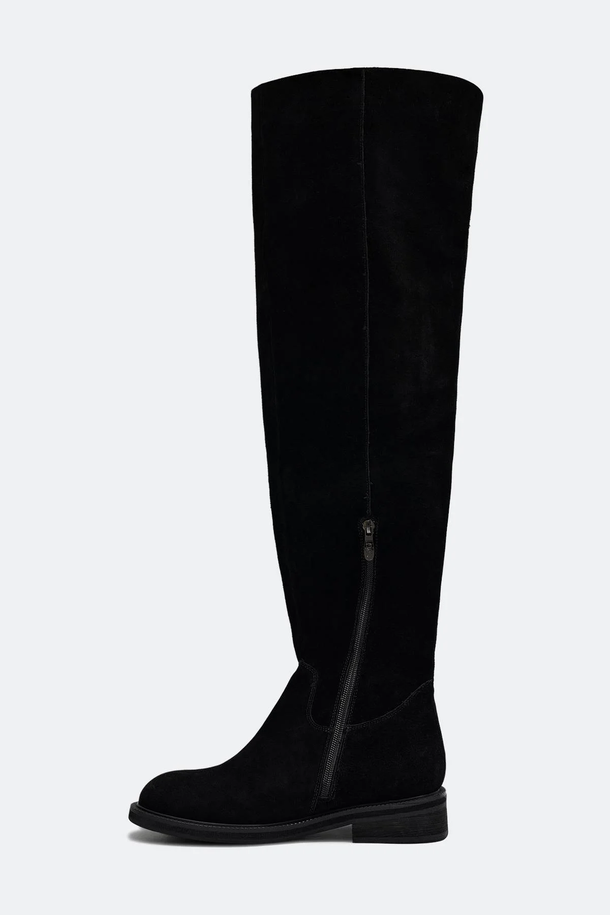 Сапоги-ботфорты из натуральной замши матовой фактуры. Мягкий закругленный мыс. Застежка на короткую молнию с внутренней стороны. Подкладка из теплого текстиля. Подошва из термопластичной резины и небольшой квадратный устойчивый каблук.