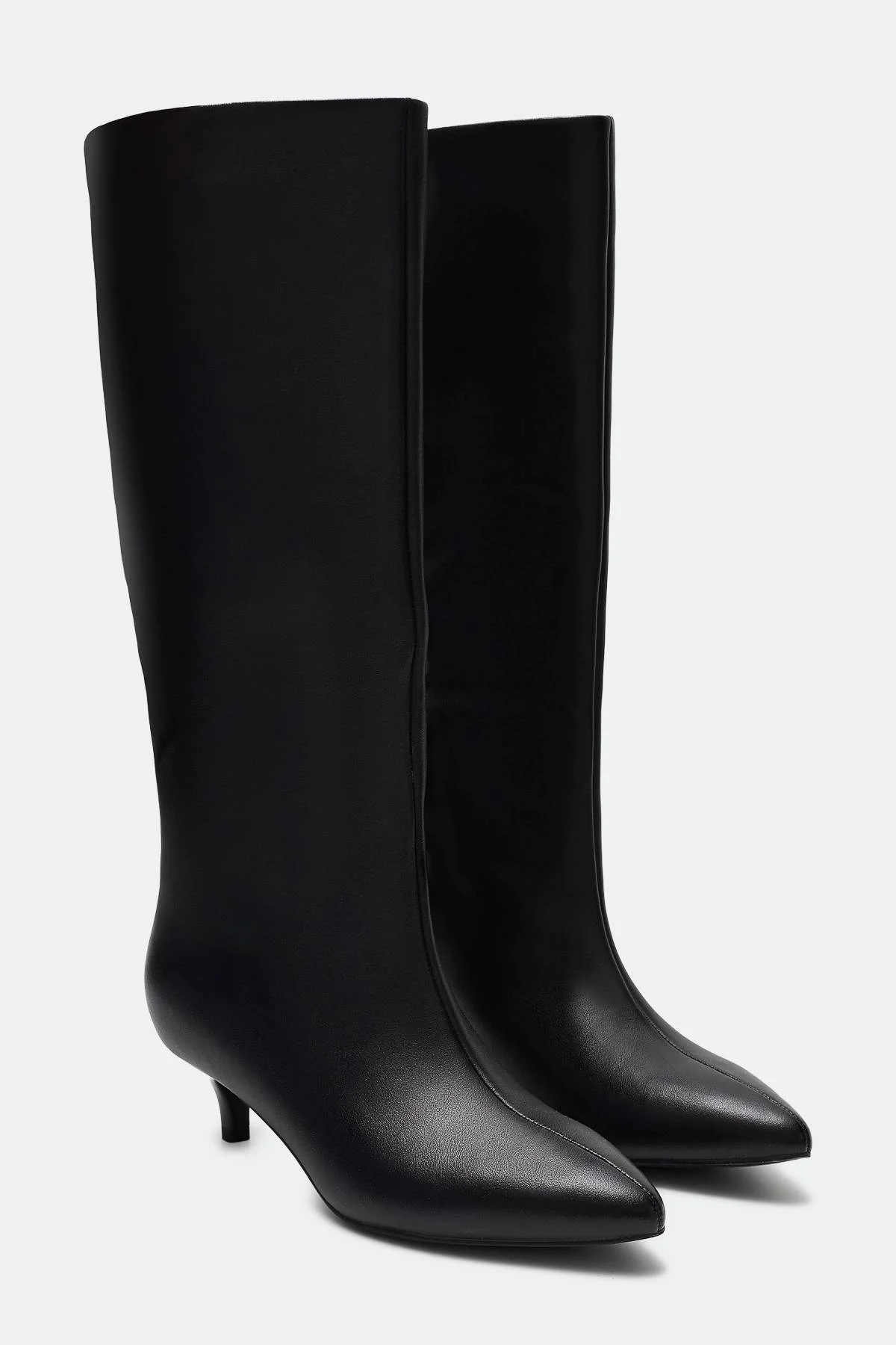 Классические сапоги из натуральной кожи гладкой фактуры. Четкий острый мыс. Подкладка и стелька из текстиля. Подошва из термопластичной резины и устойчивый каблук.