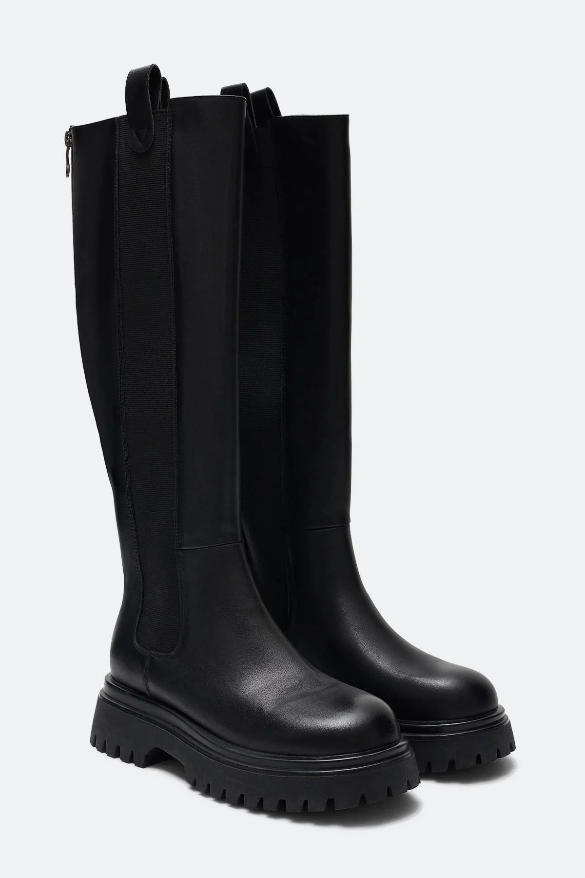 Высокие кожаные сапоги на низком каблуке. Эластичная вставка на голенище для комфортной посадки на ноге. Фактурные швы. Круглый мыс. Высокая фактурная подошва из термопластичной резины.