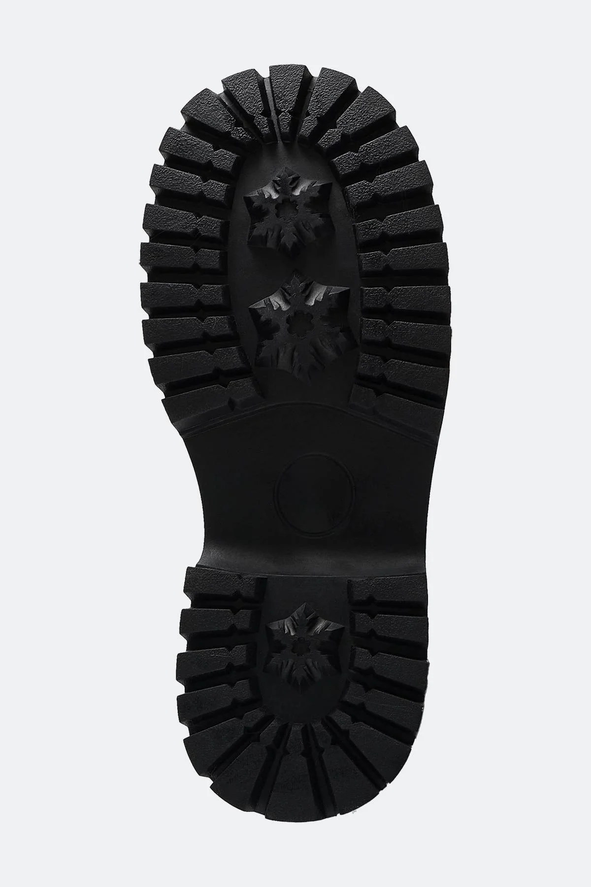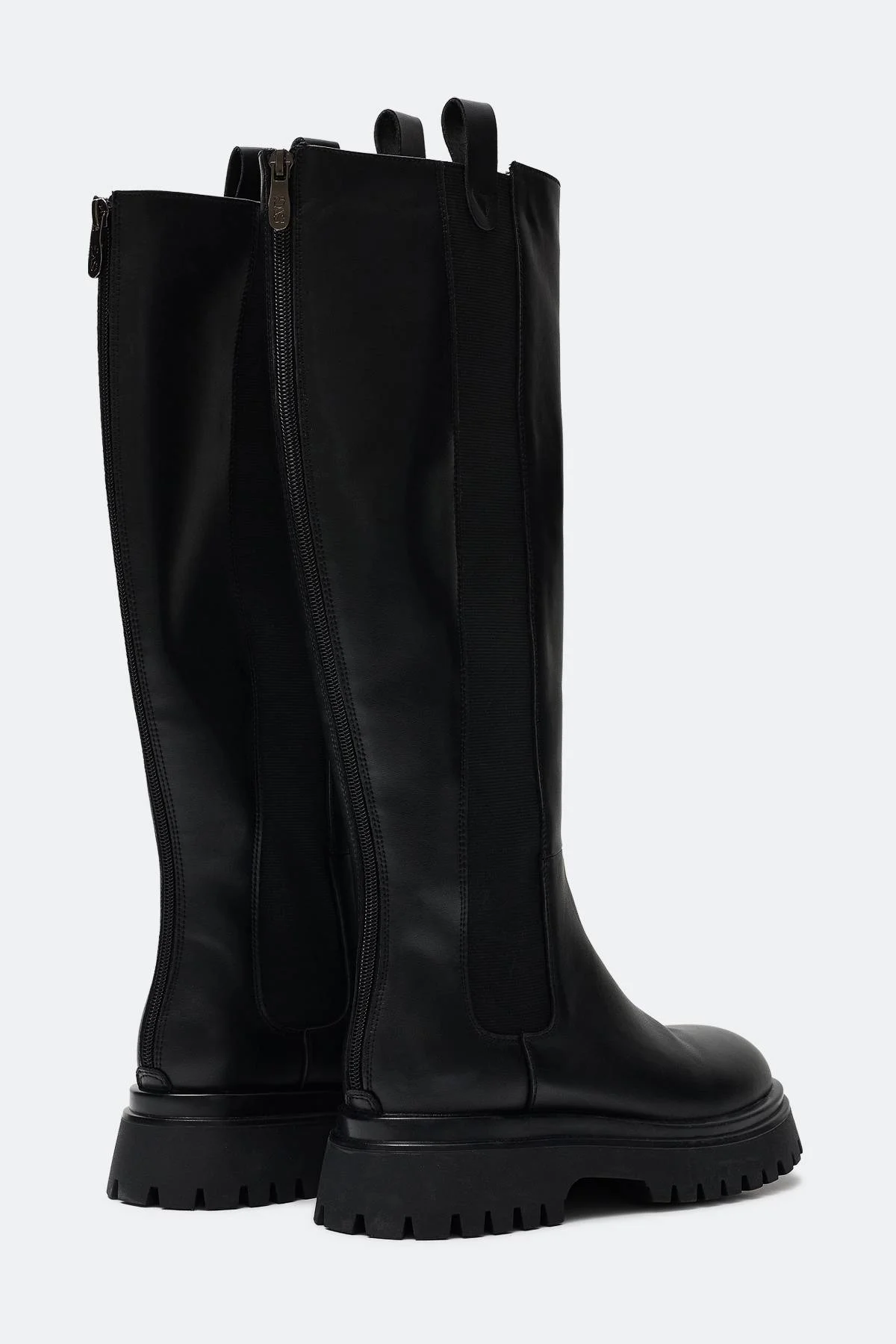 Высокие кожаные сапоги на низком каблуке. Эластичная вставка на голенище для комфортной посадки на ноге. Фактурные швы. Круглый мыс. Высокая фактурная подошва из термопластичной резины.