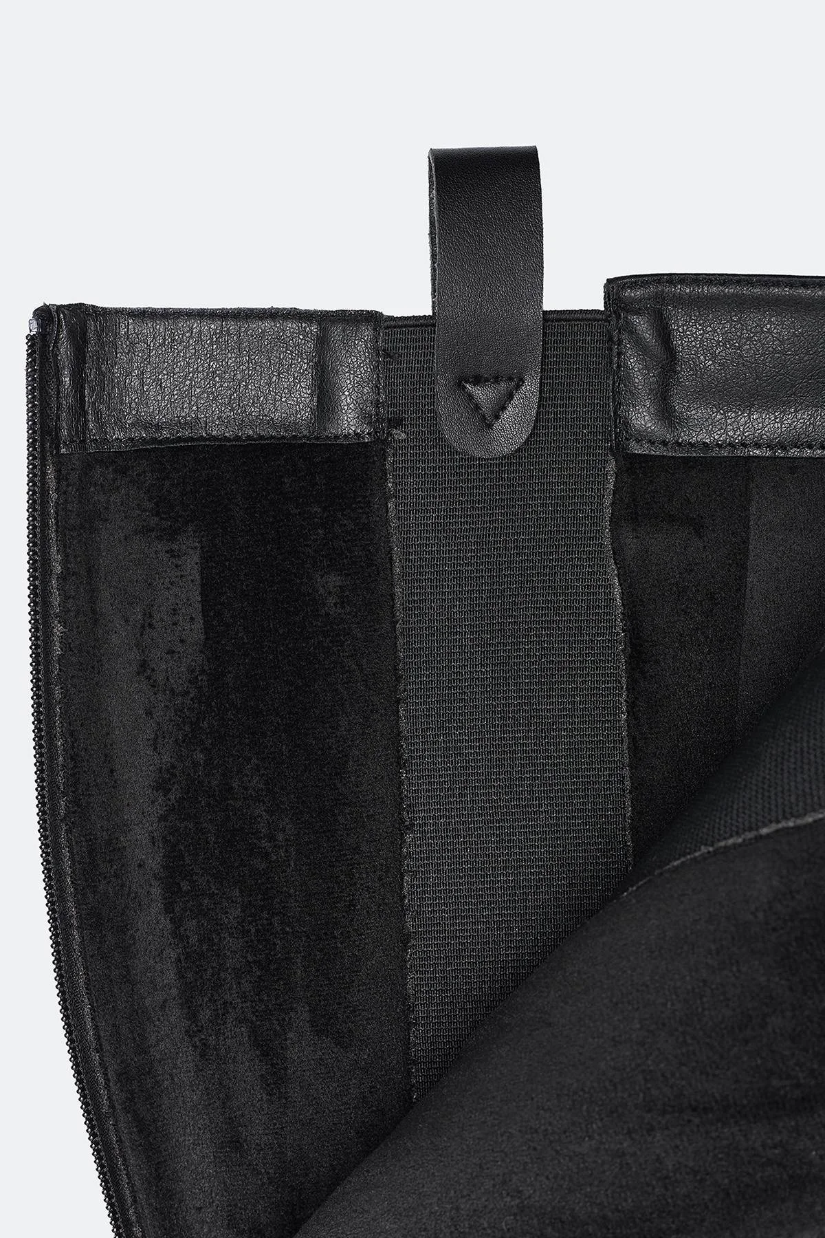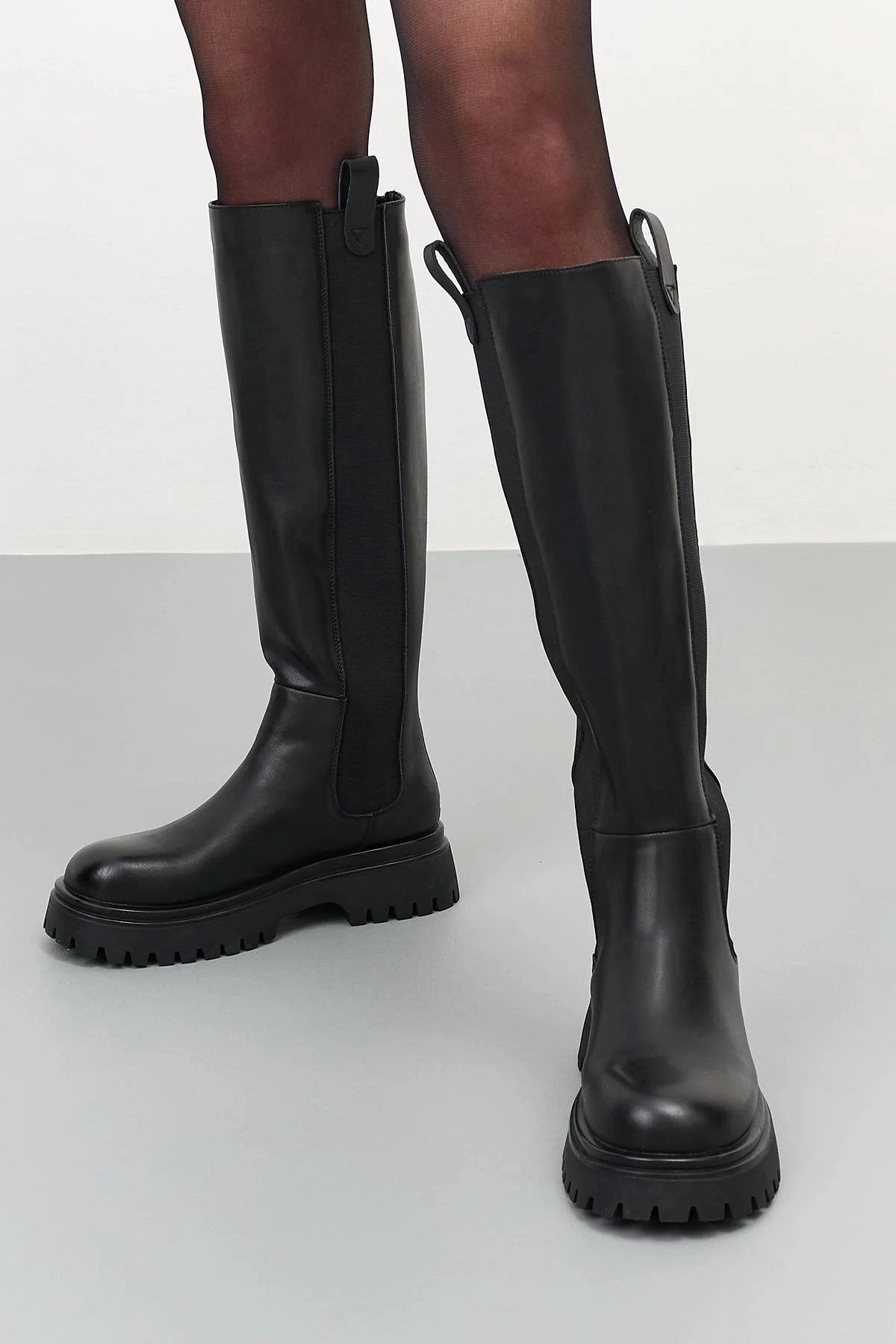 Высокие кожаные сапоги на низком каблуке. Эластичная вставка на голенище для комфортной посадки на ноге. Фактурные швы. Круглый мыс. Высокая фактурная подошва из термопластичной резины.