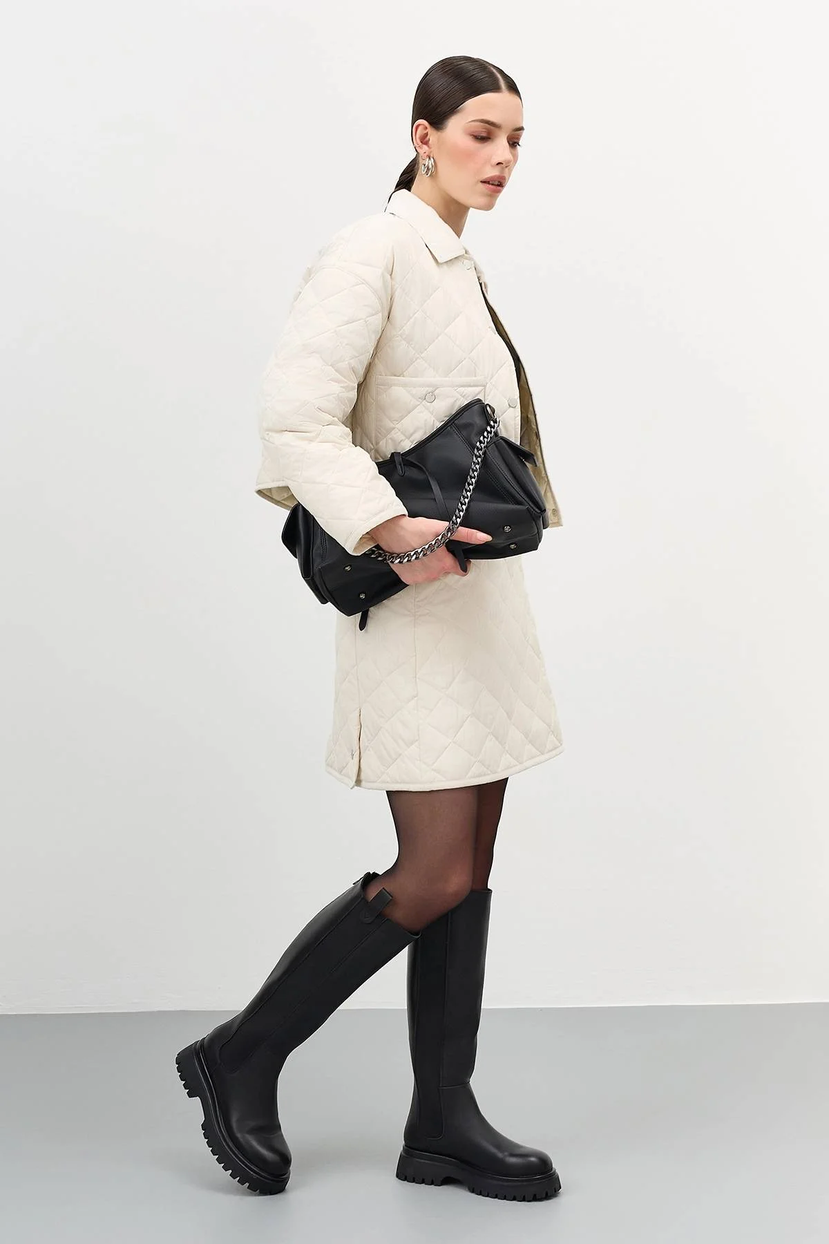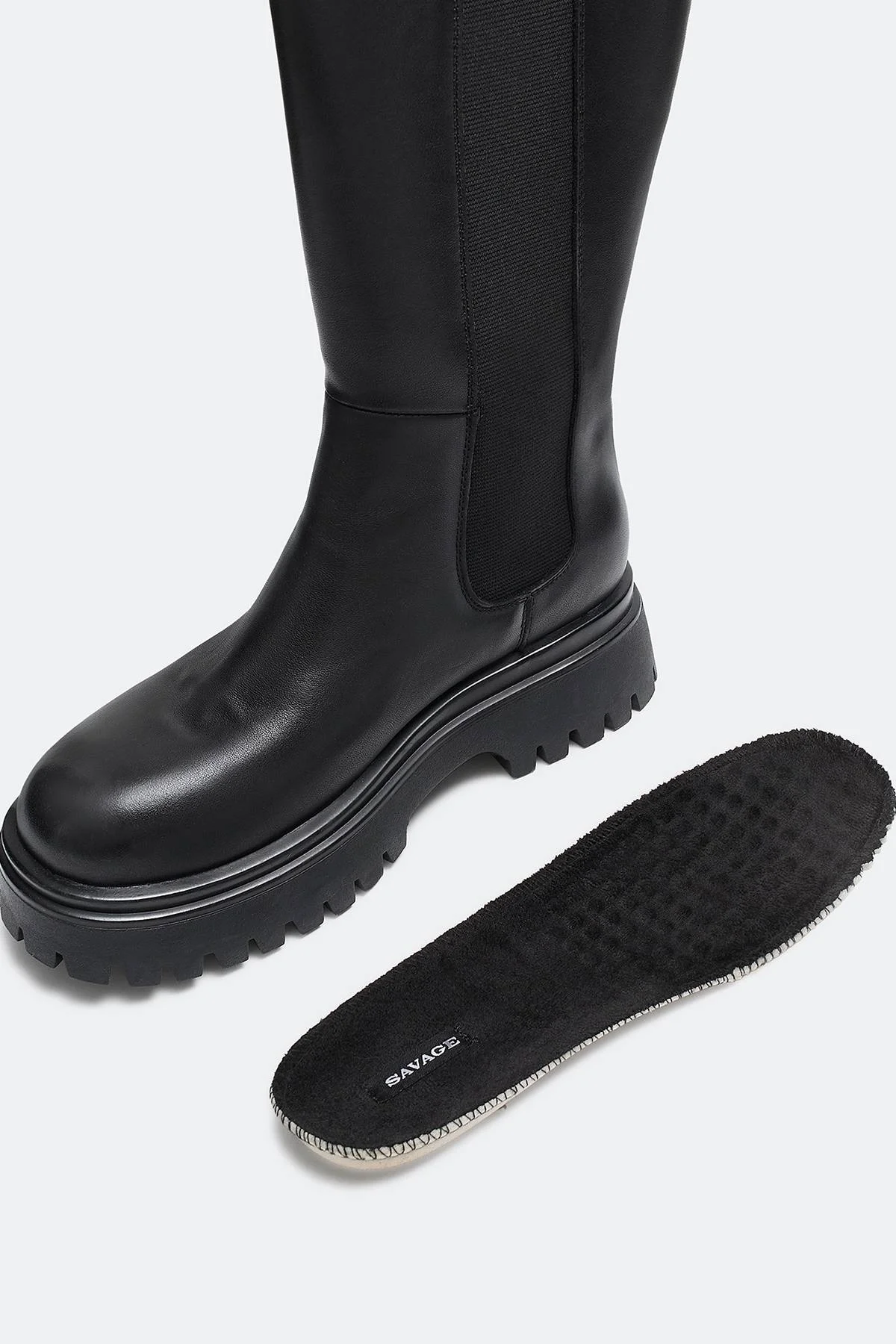 Высокие кожаные сапоги на низком каблуке. Эластичная вставка на голенище для комфортной посадки на ноге. Фактурные швы. Круглый мыс. Высокая фактурная подошва из термопластичной резины.