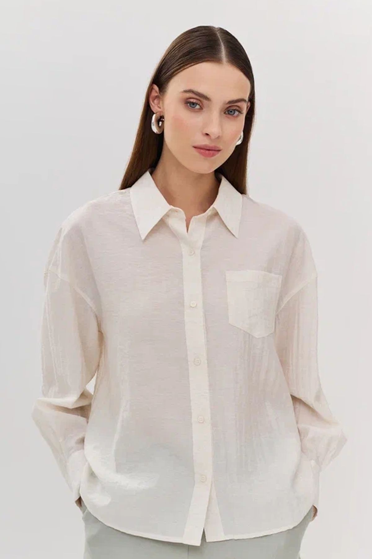 Блузка молочного цвета из полупрозрачной ткани. Сочетание волокон создает материал, который устойчив к износу. Пуговицы идеально подобраны в тон основной ткани и гармонично с ней сочетаются. Нагрудный карман на полочке — лаконичный стильный акцент. Благодаря отсутствию агрессивных декоративных элементов данную модель можно комбинировать с различными позициями гардероба.