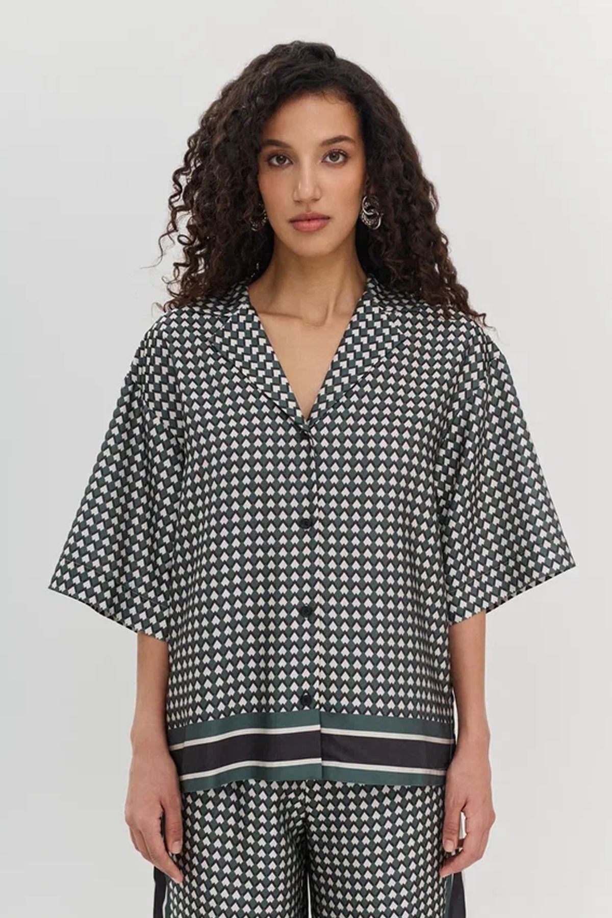 Изящная и легкая рубашка с эффектным принтом станет стильным акцентом в вашем гардеробе. Красивый низ изделия в полоску создает оригинальный контраст и добавляет уникальности дизайну. Удобный короткий рукав обеспечивает максимальный комфорт в теплую погоду. Тщательно продуманная застежка на аккуратные пуговицы и элегантный воротник придают изделию изысканность, делая блузку универсальной для различных стилей - от повседневного до более нарядного. Эта стильная модель легко комбинируется с джинсами или брюками, создавая легкий и свежий образ для любых случаев.