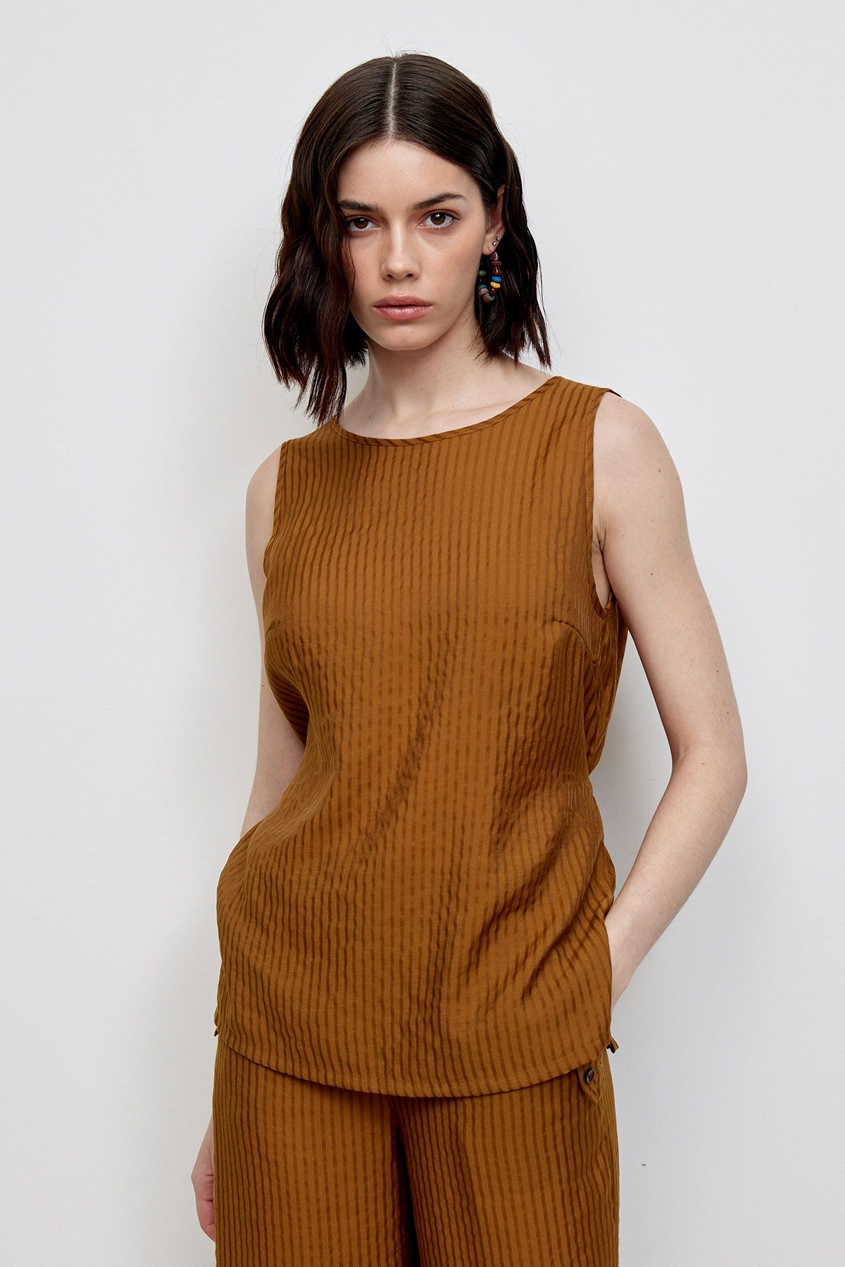 Блузка без рукавов торговой марки Bulmer. Ткань с тисненной полоской. Свободный силуэт. Разрезы по бокам. Декорирована тонким шнуром. V-образный вырез на спинке.