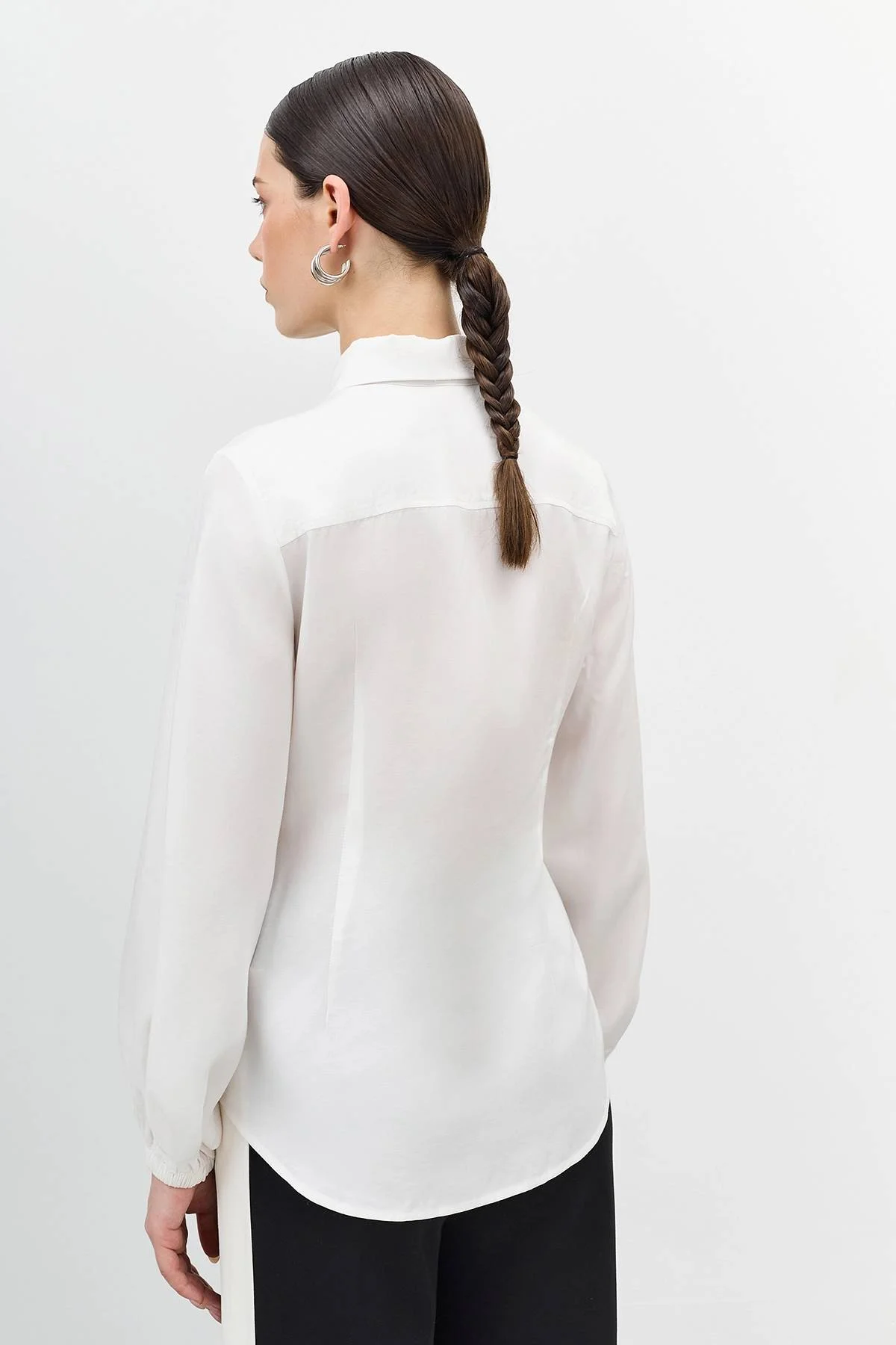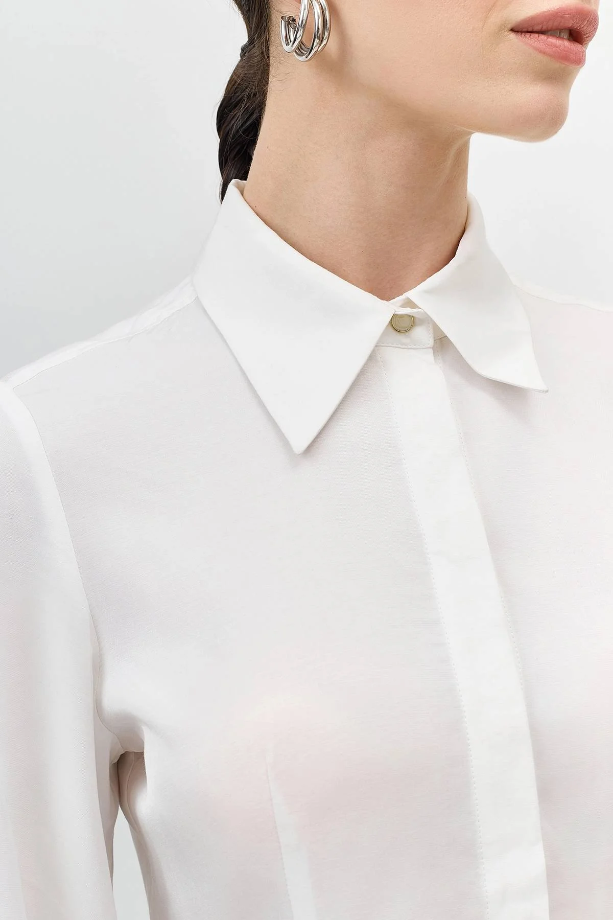 Блузка Savage - блузка с длинными объемными рукавами из 100% вискозы. Полуприталенный силуэт. Отложной воротник. Потайная застежка на пуговицы. Резинки по низу рукавов. В комплекте с черным ремнем SVG202502.