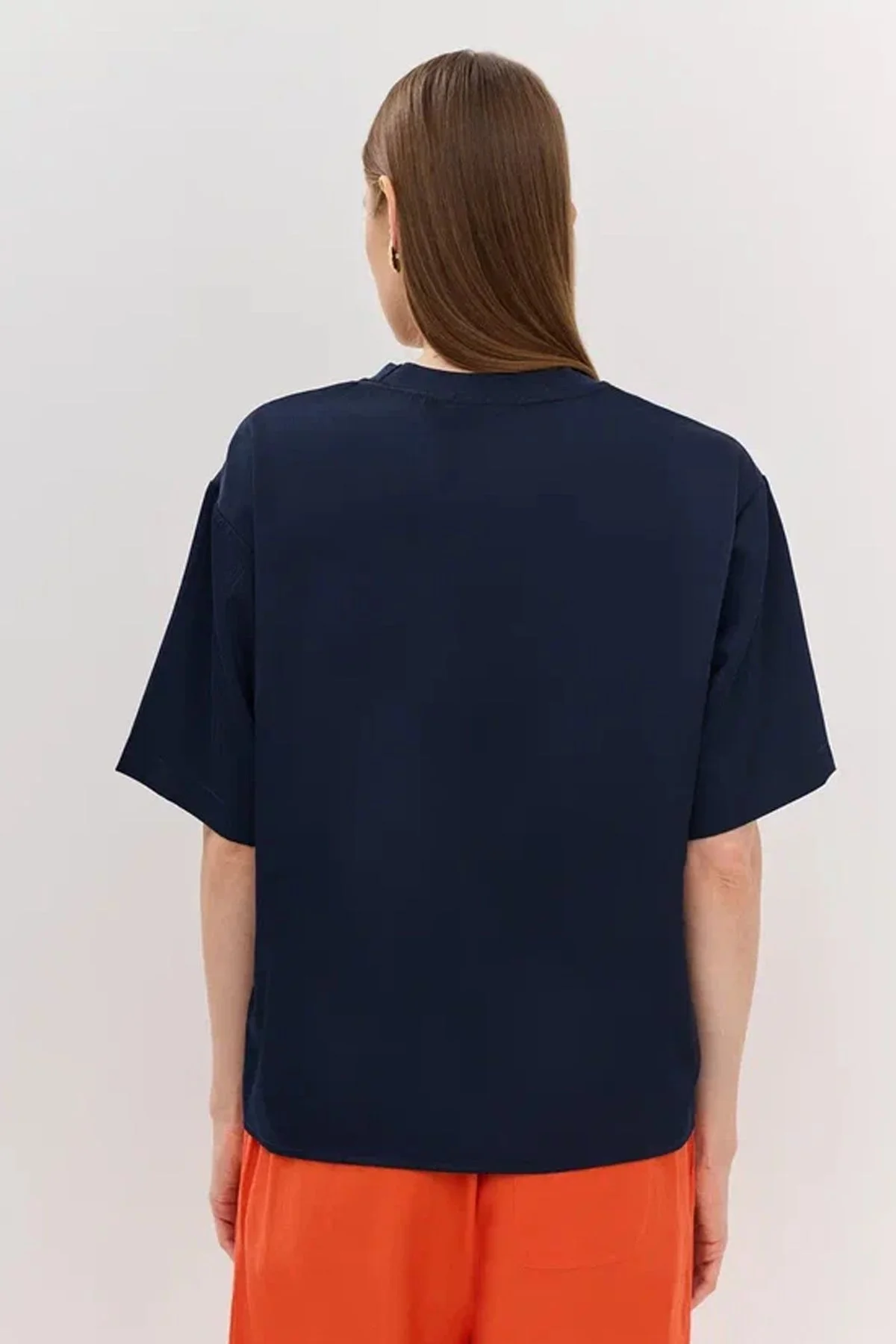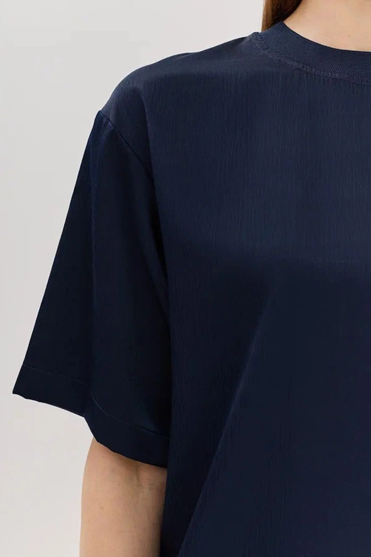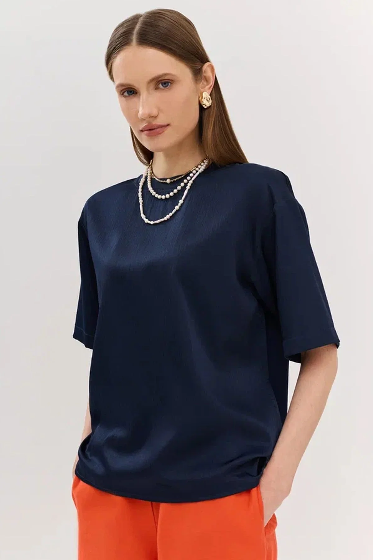 Однотонная блузка тёмно-синего цвета с коротким рукавом, 48р