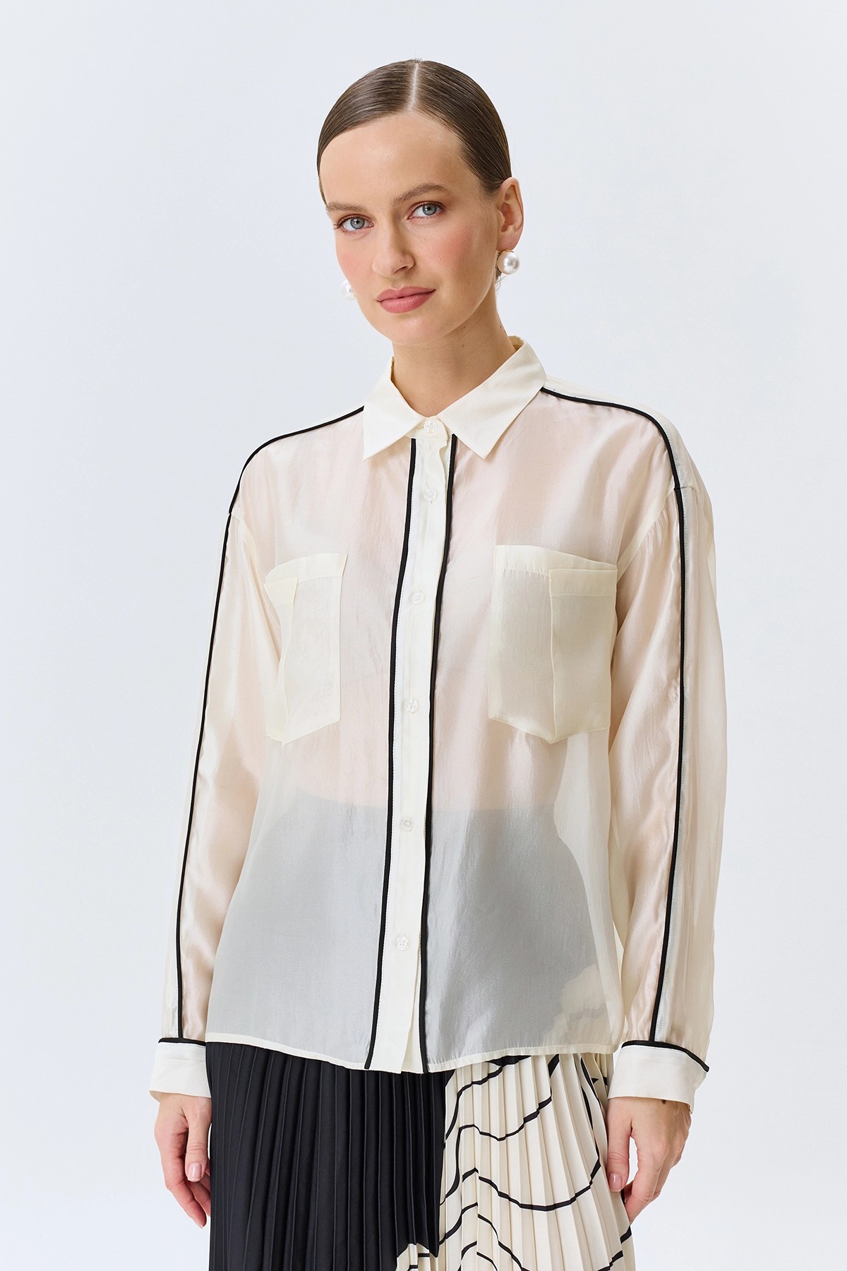 Полупрозрачная блузка с контрастными кантами, 38