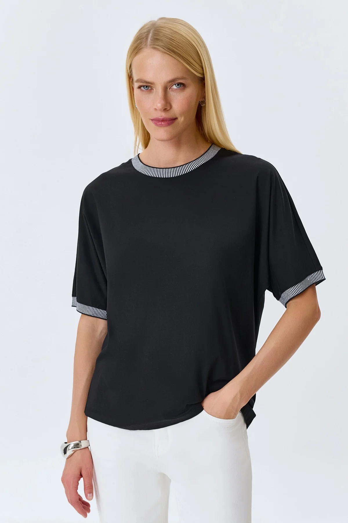 Свободная блузка с контрастным рибом, 34