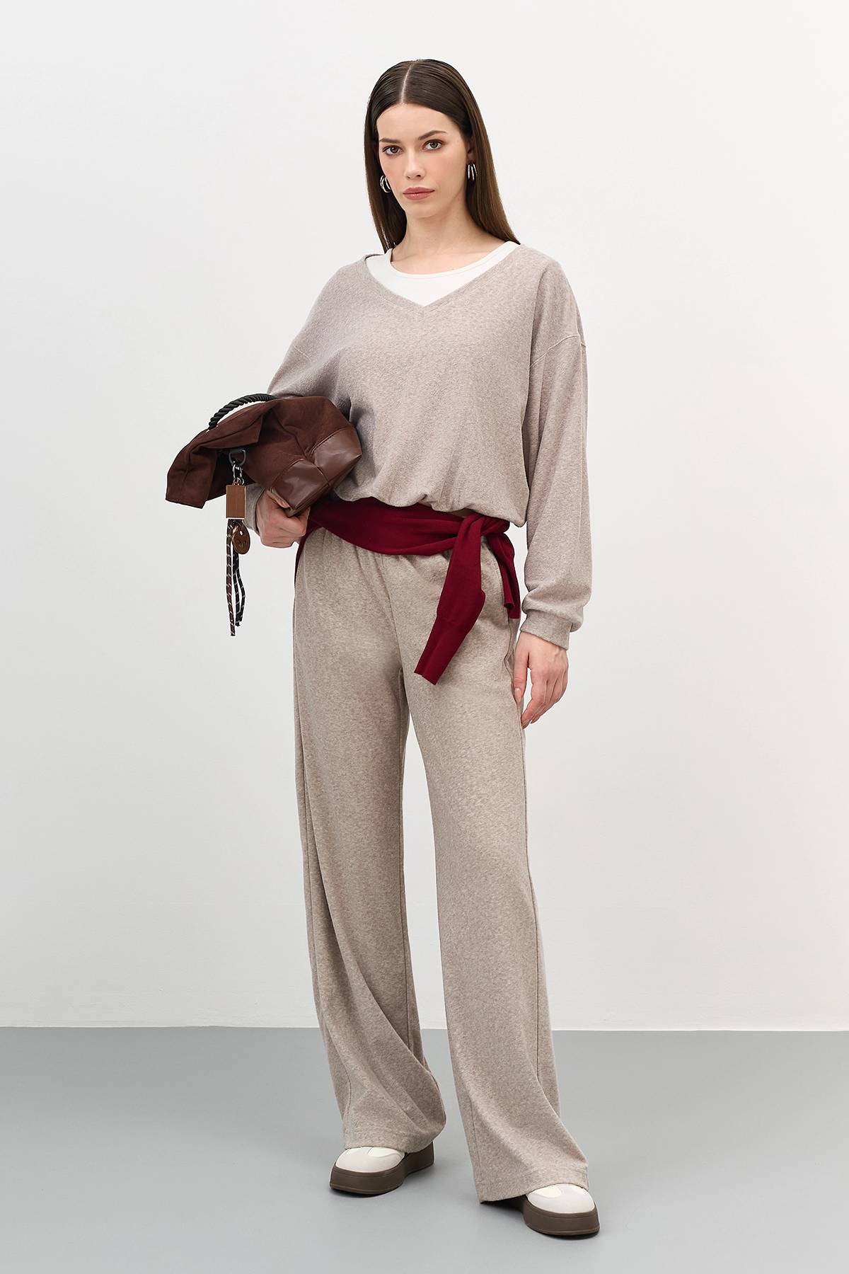Брюки из фактурного трикотажа в цвете какао, 40