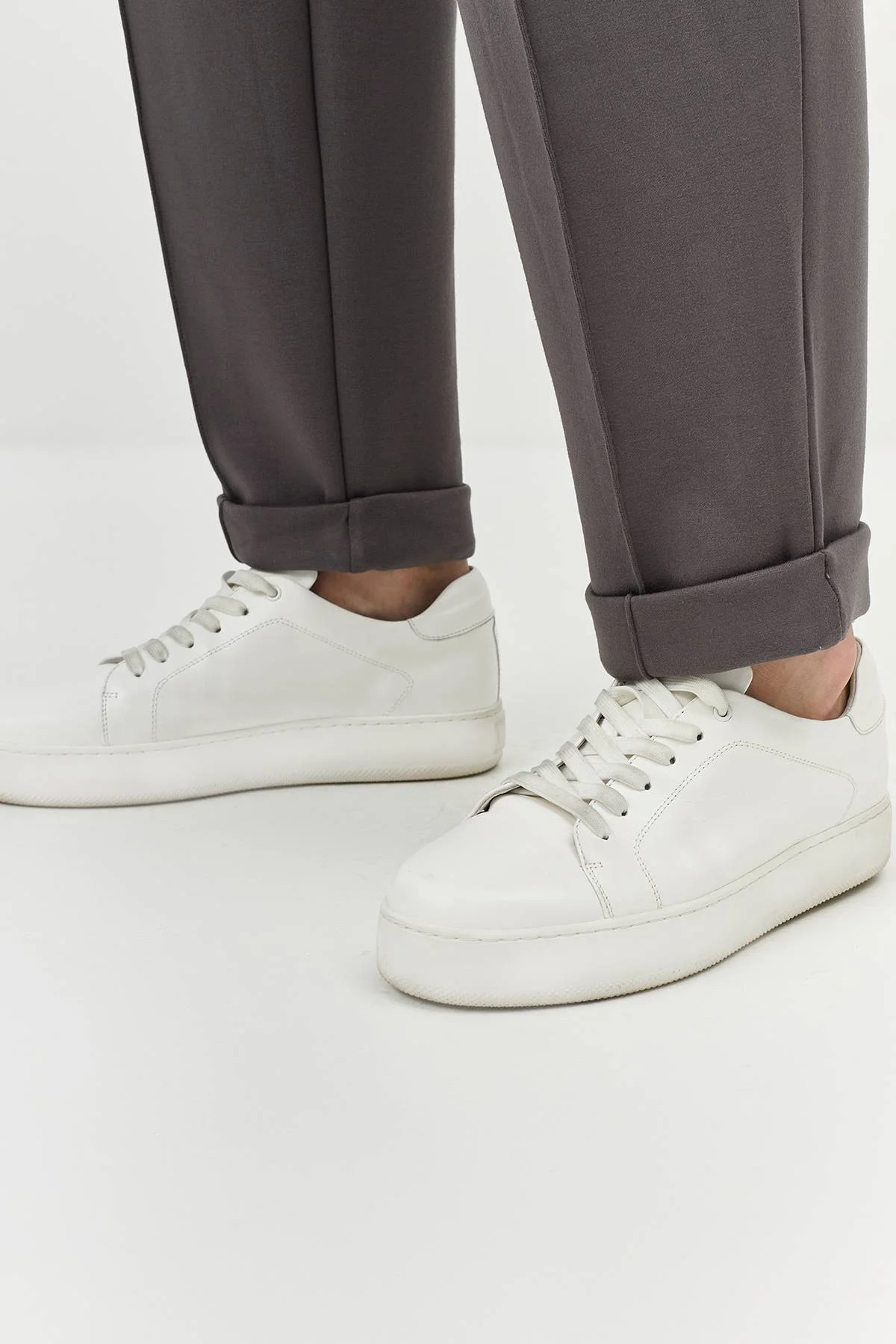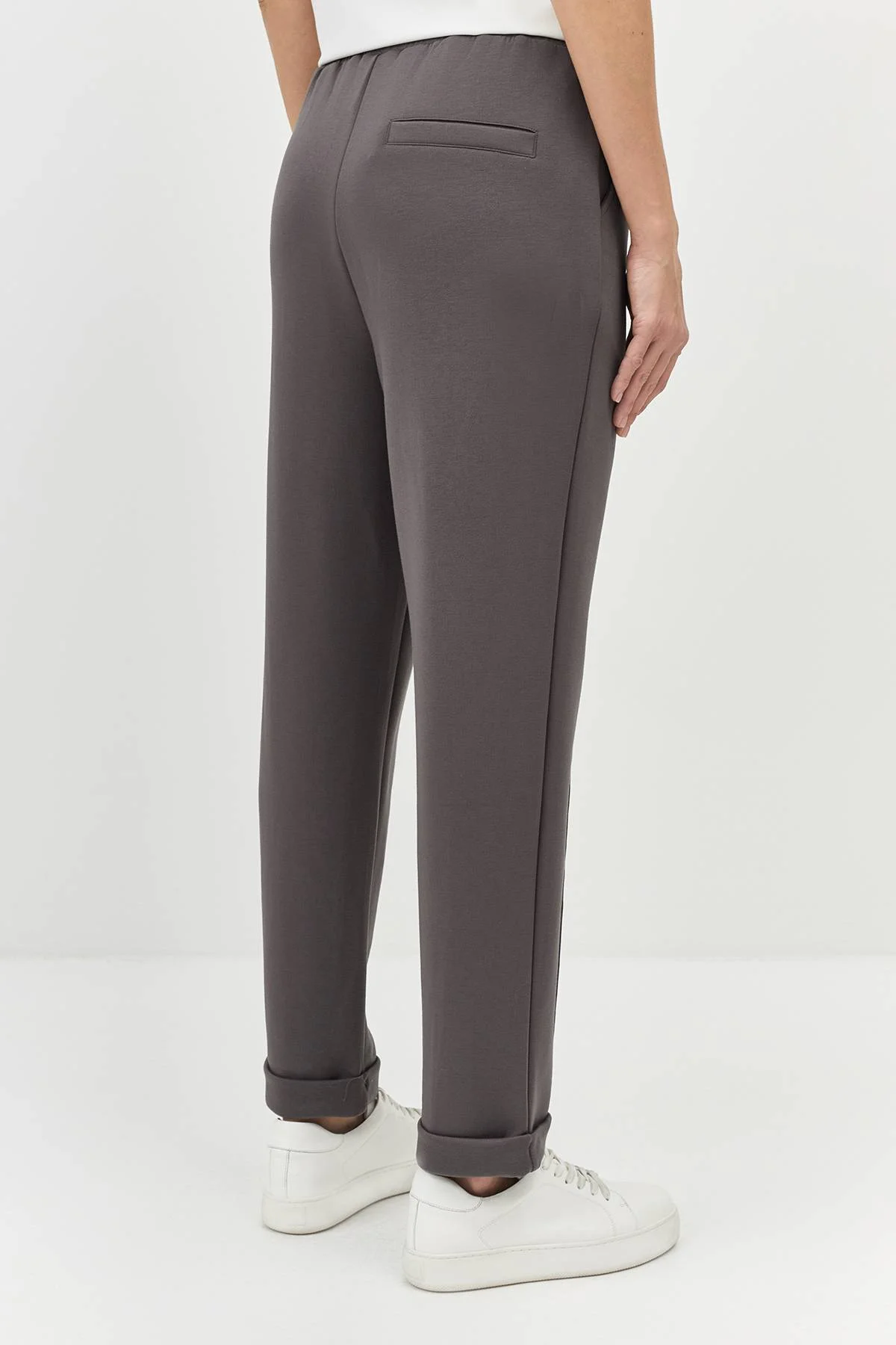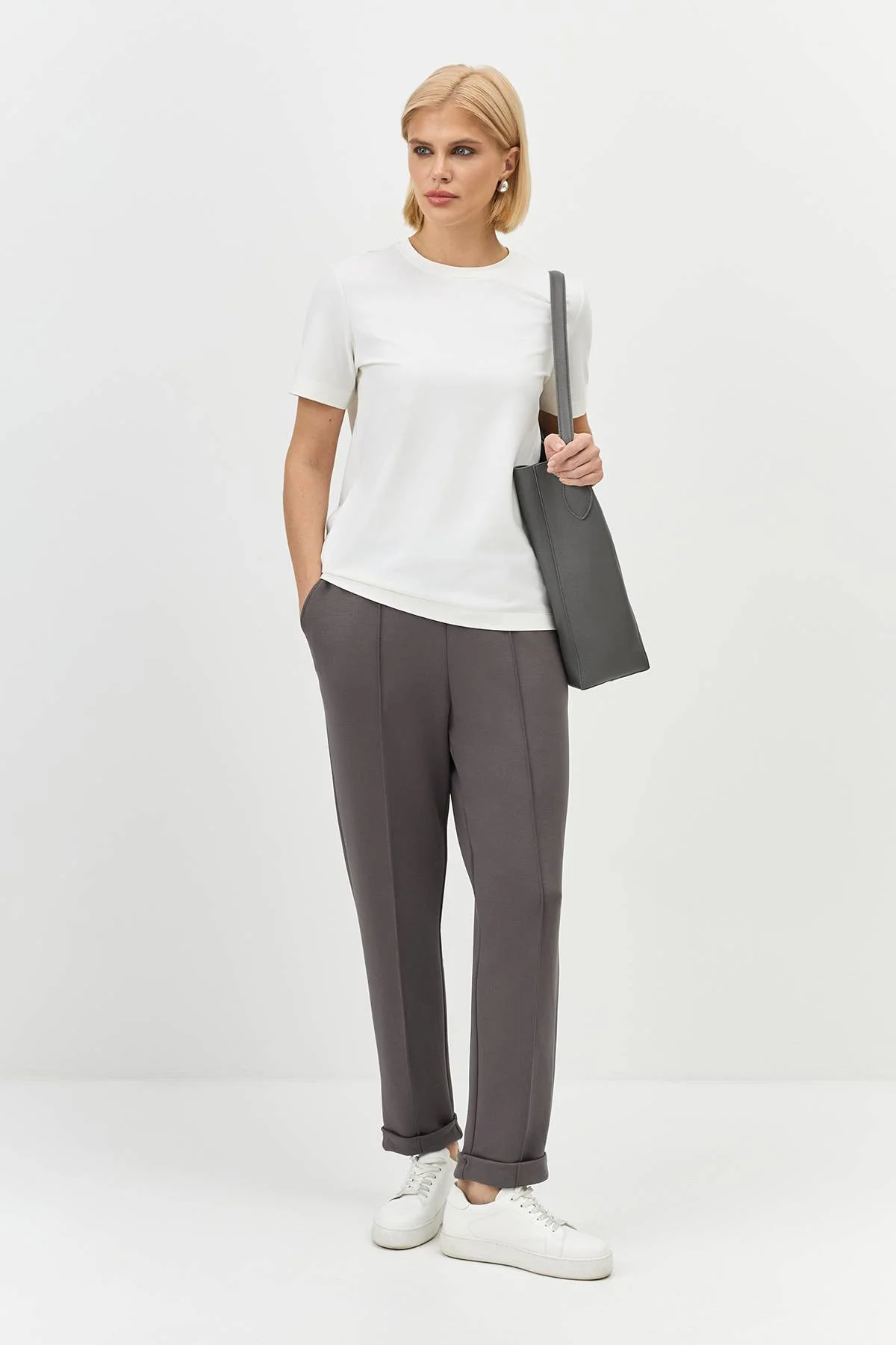 Свободный прямой силуэт, мягко сужениенный к низу, делает модель универсальной. Регулируемая талия на резинке и шнурке обеспечивает идеальную посадку. Детали в виде застроченных стрелок и отворотов добавляют модели классическую утонченность.