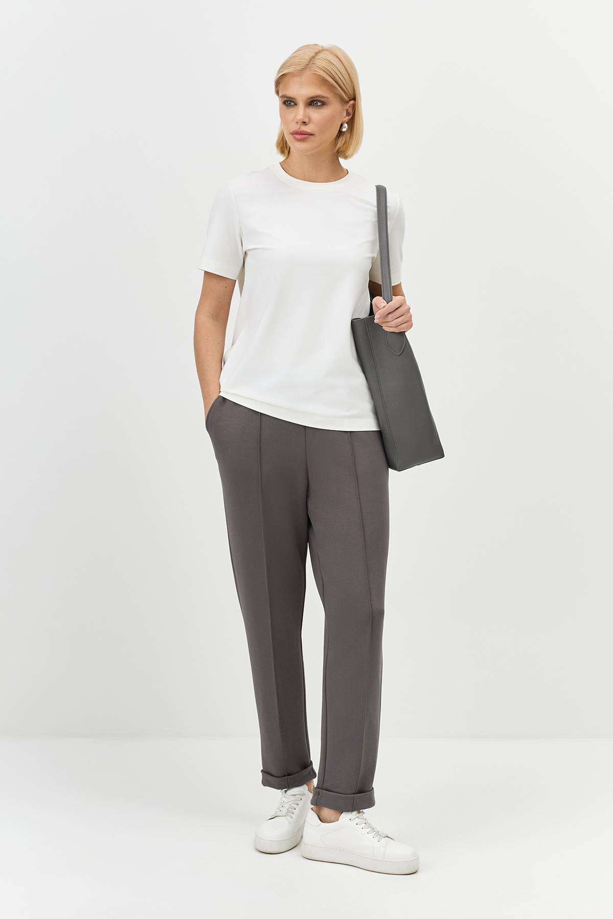 Свободный прямой силуэт, мягко сужениенный к низу, делает модель универсальной. Регулируемая талия на резинке и шнурке обеспечивает идеальную посадку. Детали в виде застроченных стрелок и отворотов добавляют модели классическую утонченность.