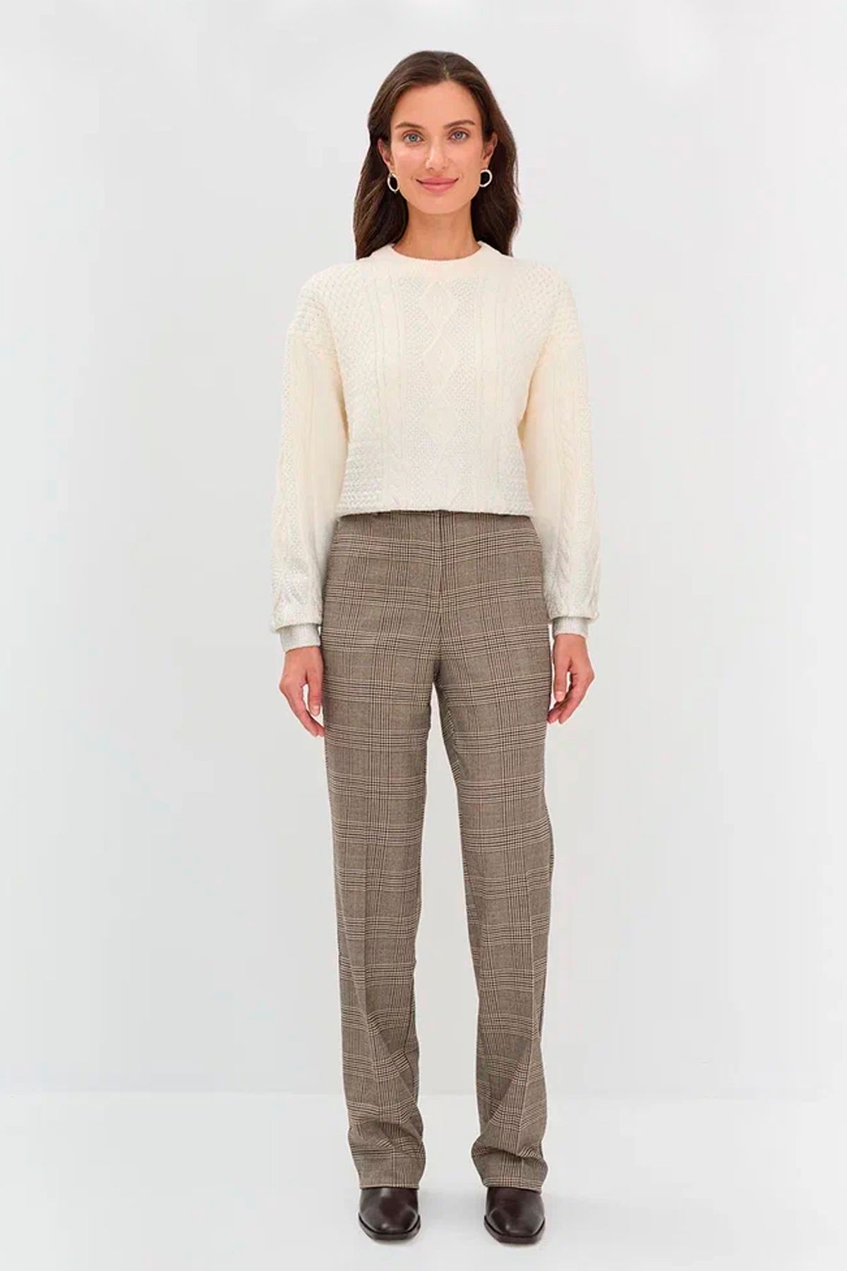 Брюки прямого кроя с клетчатым принтом - приятный визуальный акцент как для не строгого офисного дресс-кода, так и для ежедневных образов. Мягкие стрелки добавляют внимания к прямым линиям. Удобство и практичность обеспечивается за счёт застёжки молнии с пуговицей, а также карманов в боковых швах. Шлёвки позволяют дополнить брюки поясом. Для завершённого комплекта рекомендуется сочетать брюки с жакетом арт. 50314/75.