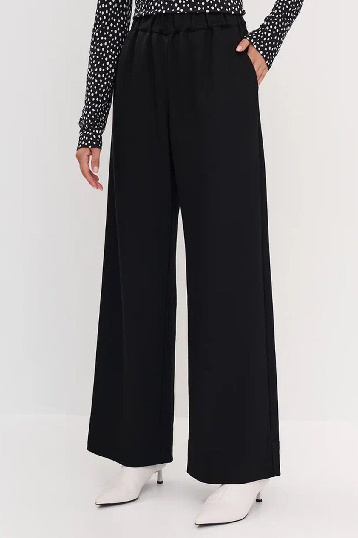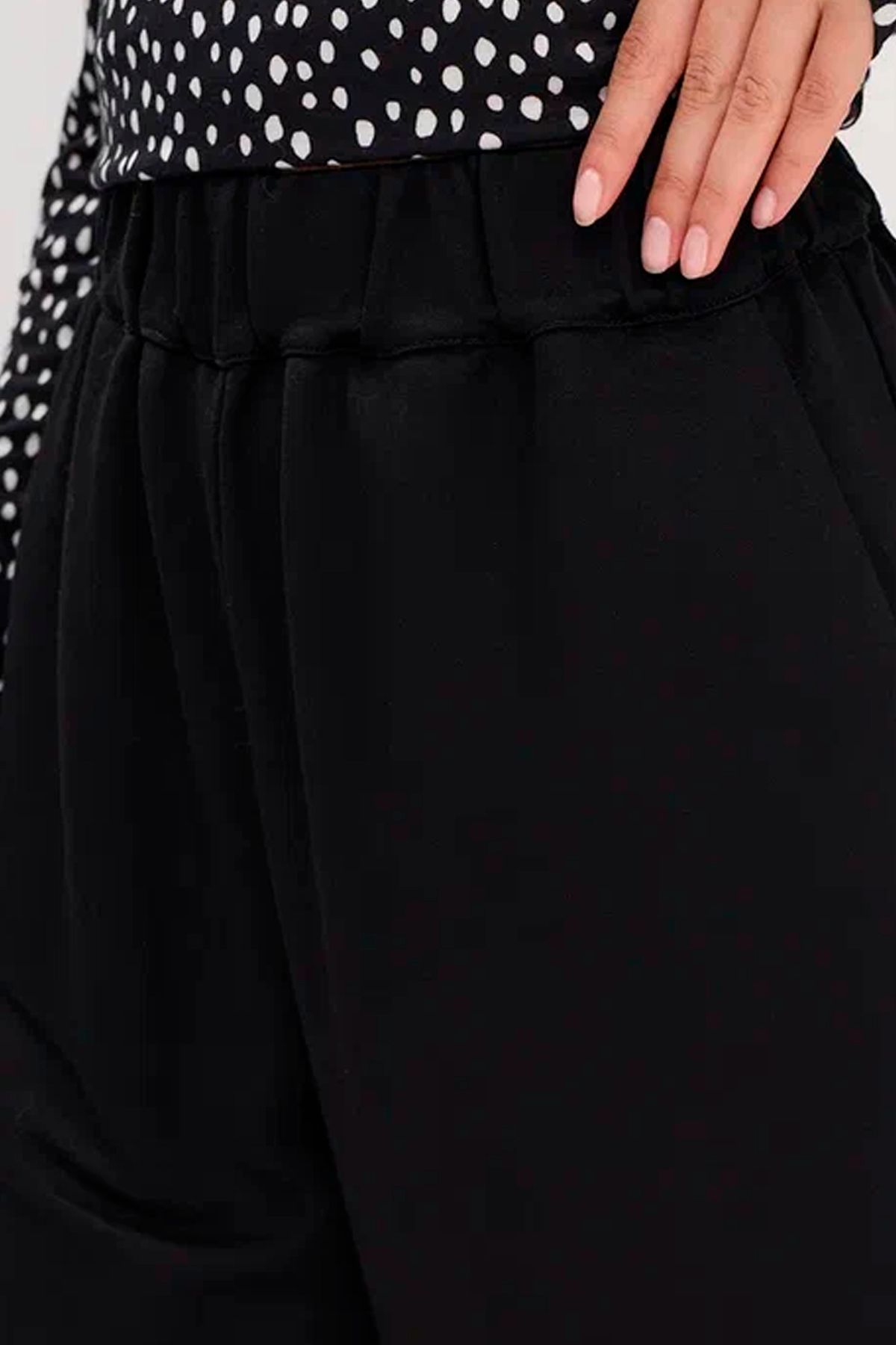 Чёрные однотонные брюки с резинкой на талии - универсальная позиция в гардеробе. За счёт наличия вискозы обеспечивается приятная тактильность материала. Резинка на талии создает максимальный комфорт при ношении, а карманы в боковых разрезах добавляют практичность модели. Широкие штанины не сковывают движения. В сочетании с блузкой арт. 50832/9 образуется полноценный комплект.