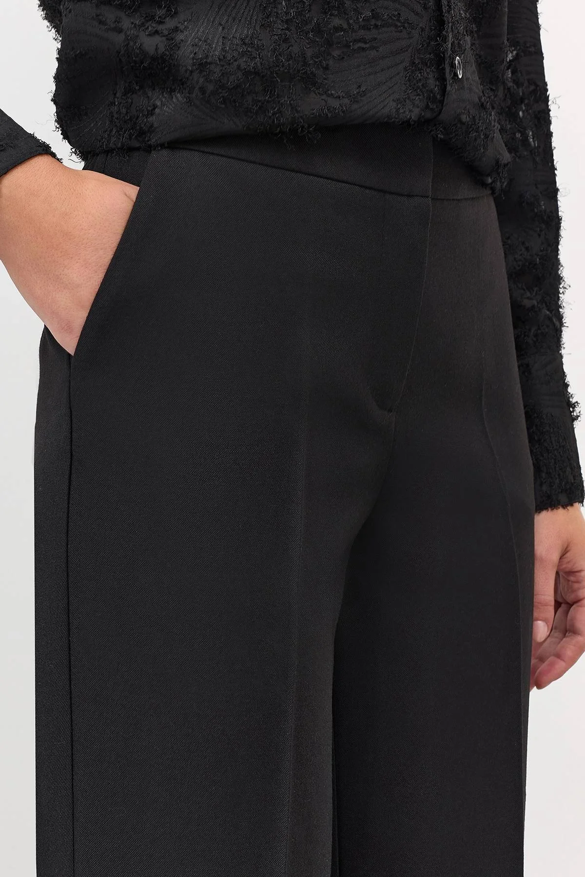 Классические брюки выполнены из плотной ткани черного цвета с гладкой поверхностью, обеспечивающей элегантный внешний вид. Модель обладает прямым кроем, поясом с шлёвками и скрытой застёжкой на молнии и крючке. В комплекте с ремнем SVG202517.