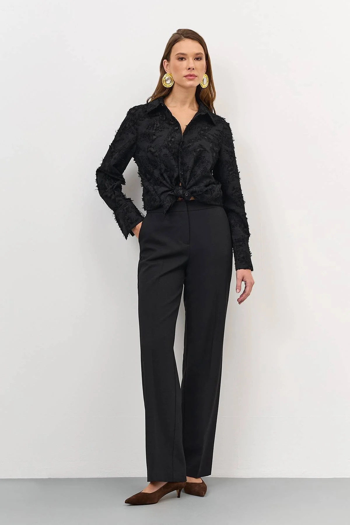 Классические брюки выполнены из плотной ткани черного цвета с гладкой поверхностью, обеспечивающей элегантный внешний вид. Модель обладает прямым кроем, поясом с шлёвками и скрытой застёжкой на молнии и крючке. В комплекте с ремнем SVG202517.