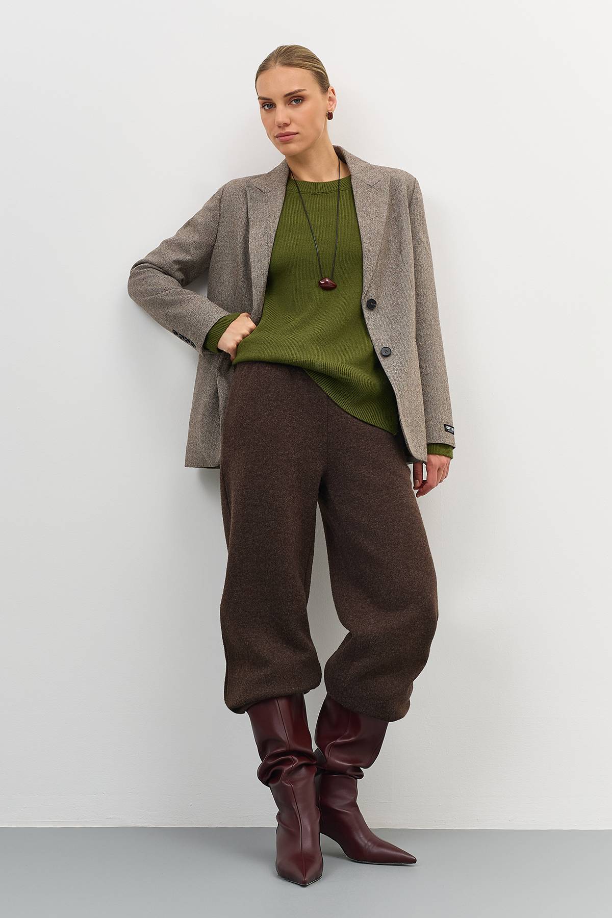 Модель из коллекции Осень-Зима 2025 станет незаменимой деталью вашего гардероба в прохладное время года. Прямой силуэт брюк идеально подчеркнет вашу фигуру, а резинка по линии талии обеспечит максимальный комфорт в носке. Боковые карманы в швах добавят практичности, а состав материала с добавлением шерсти подарит приятное тепло в осенние и зимние дни, одновременно костюмные штаны не колются, за счет того, что ткань изнутри трикотажная. Однотонный дизайн в коричневом или темно-коричневом цвете легко сочетается с любыми верхами, позволяя создавать как повседневные, так и более элегантные образы. Бережная машинная стирка при t не более 30ᵒС; не отбеливать; запрещена сушка в барабане машины; утюжить при средней температуре утюга не более 110ᵒС; деликатная химическая чистка.