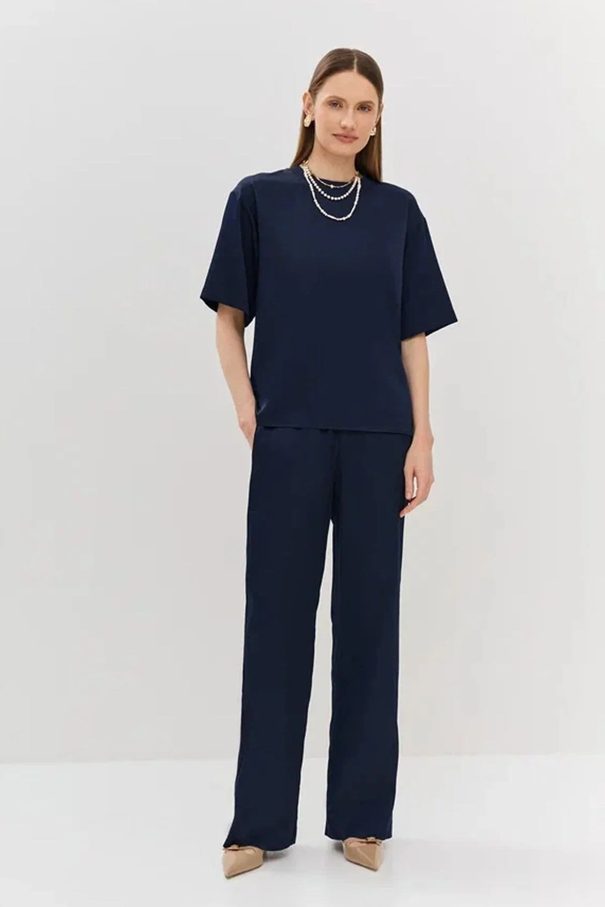 Прямые брюки тёмно-синего цвета с резинкой на талии, 42р