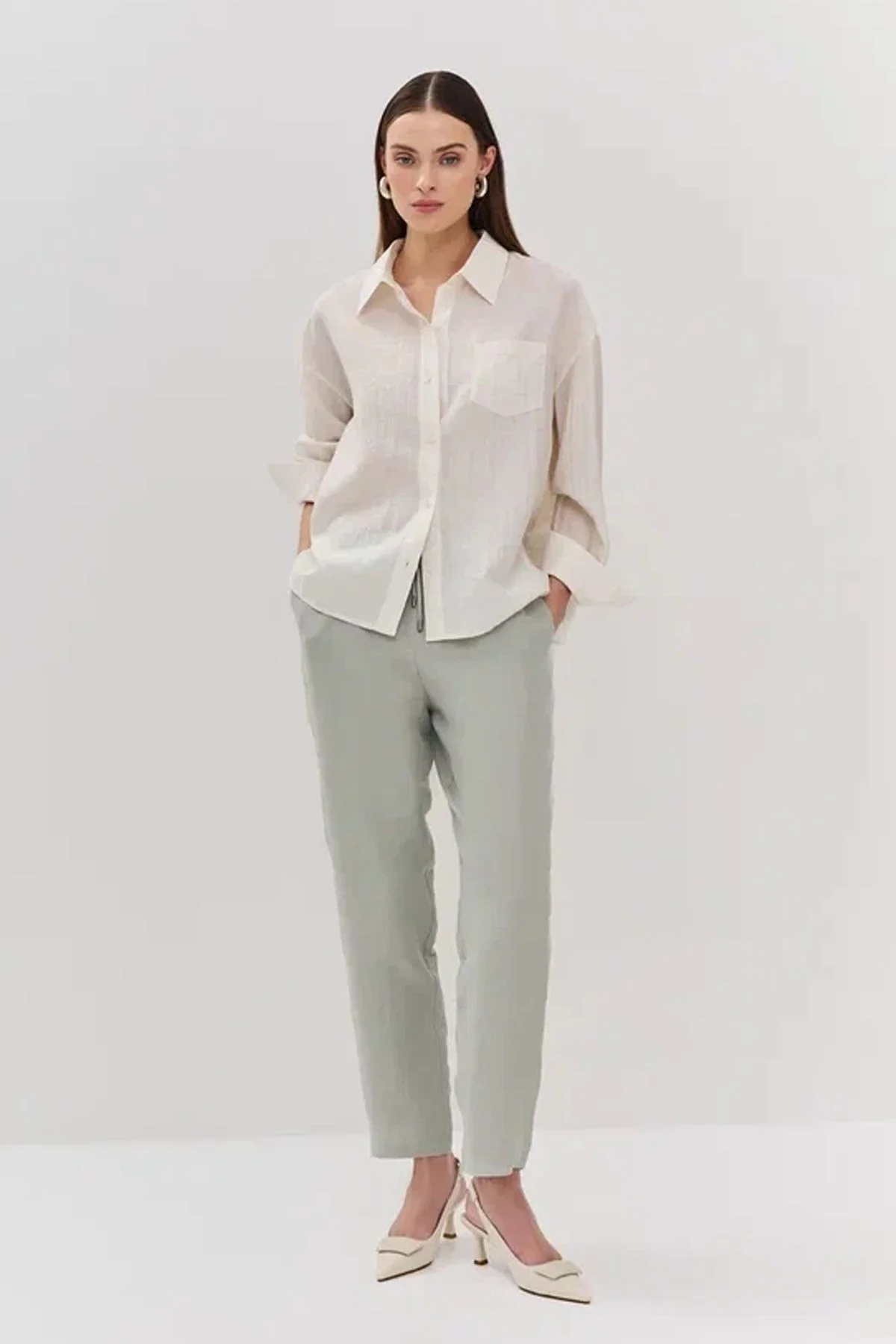 Прямые брюки светло-оливкового цвета со шнурком на талии, 42р