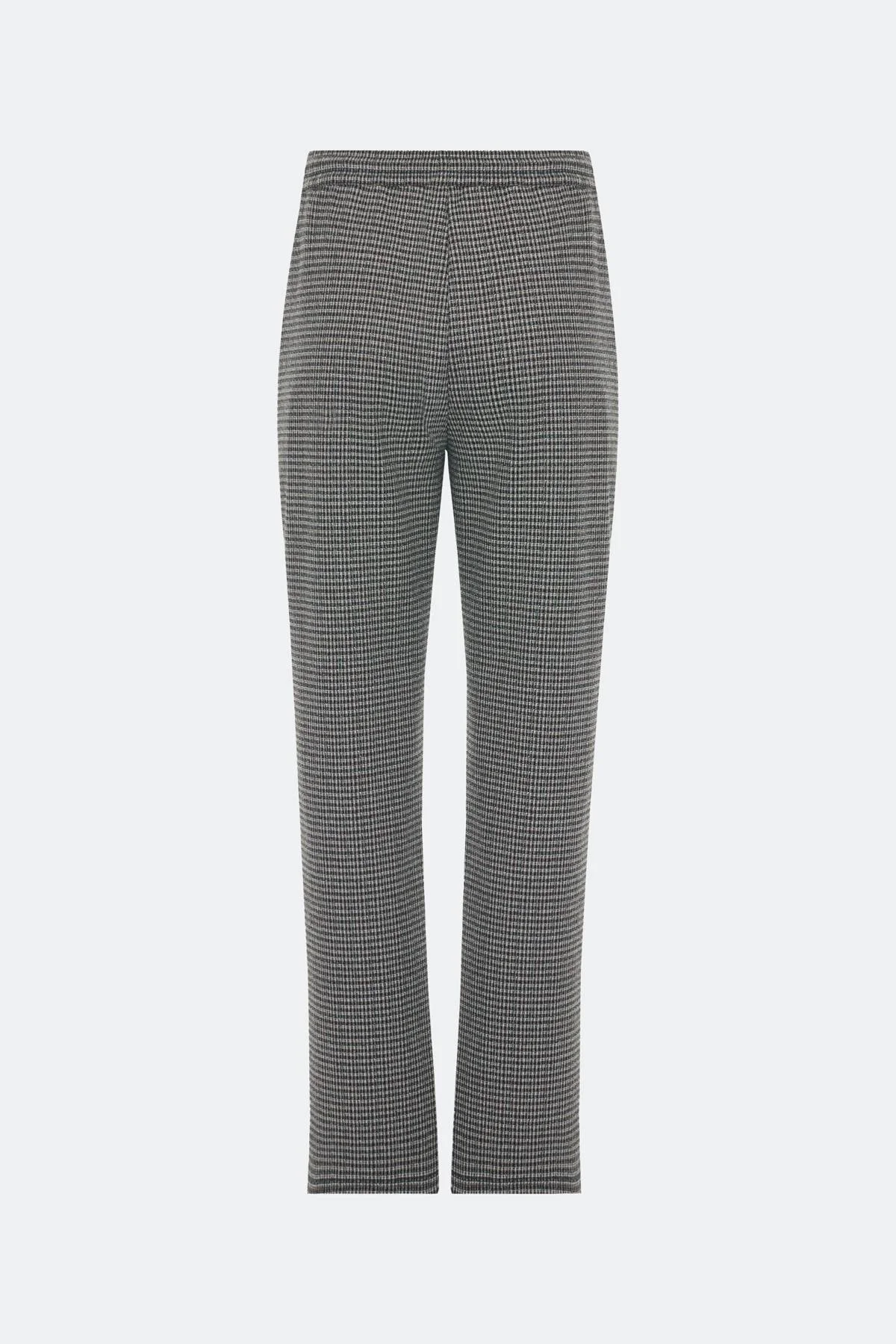 Расслабленные брюки из джерси в мелкую клетку из смесовой вискозы. Свободный силуэт немного заужен к низу. Резинка и шнурок по линии талии. Боковые карманы в швах.