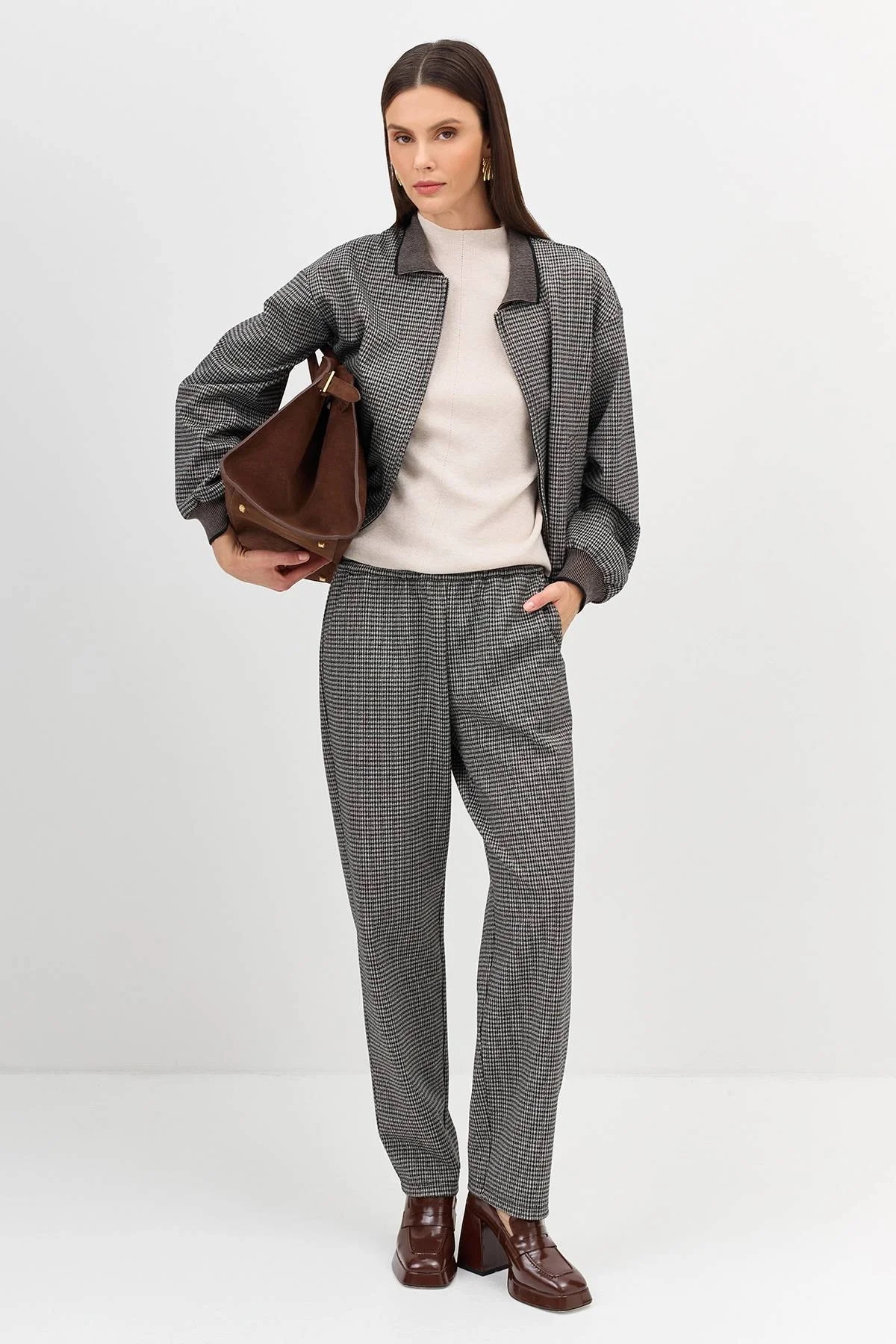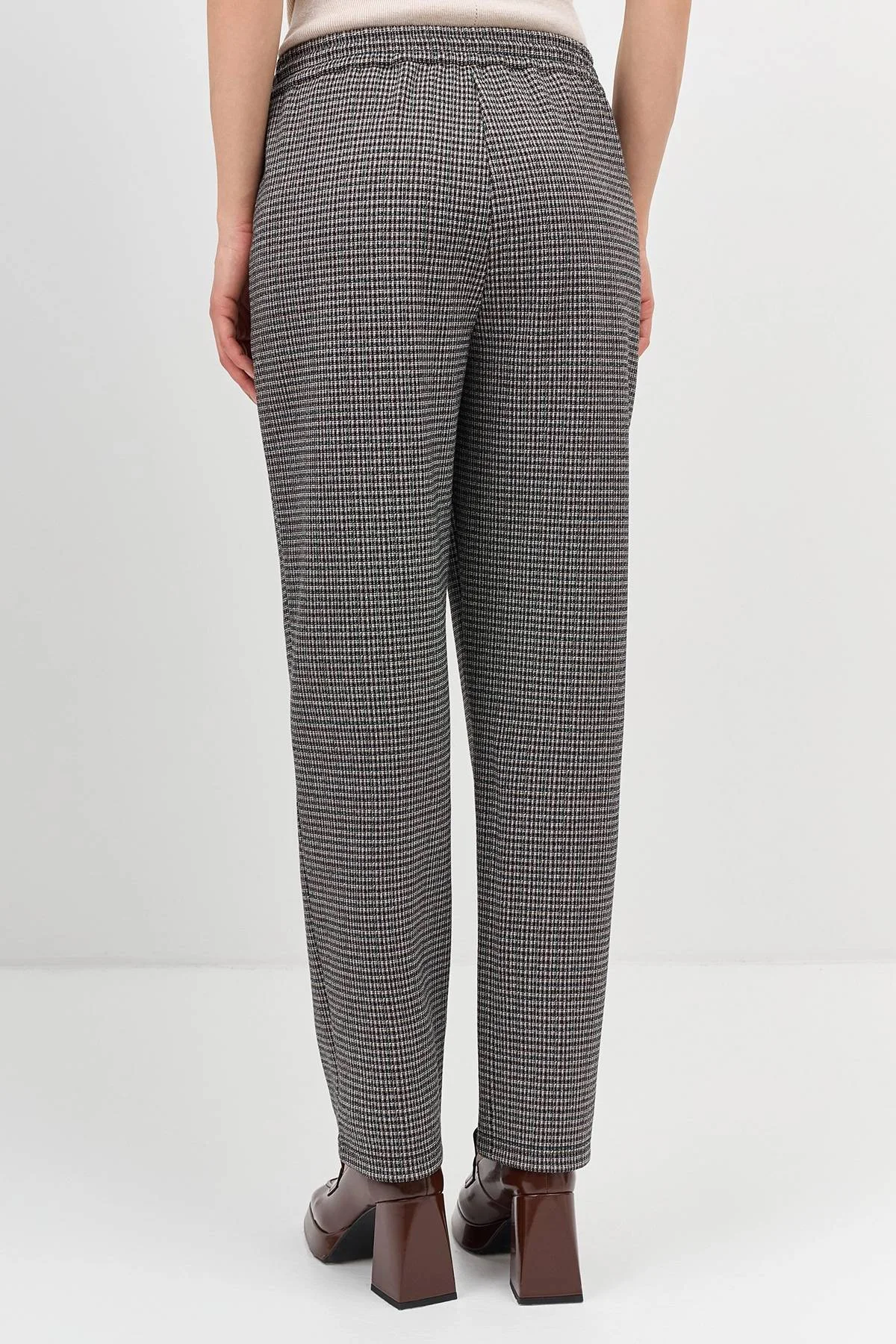 Расслабленные брюки из джерси в мелкую клетку из смесовой вискозы. Свободный силуэт немного заужен к низу. Резинка и шнурок по линии талии. Боковые карманы в швах.