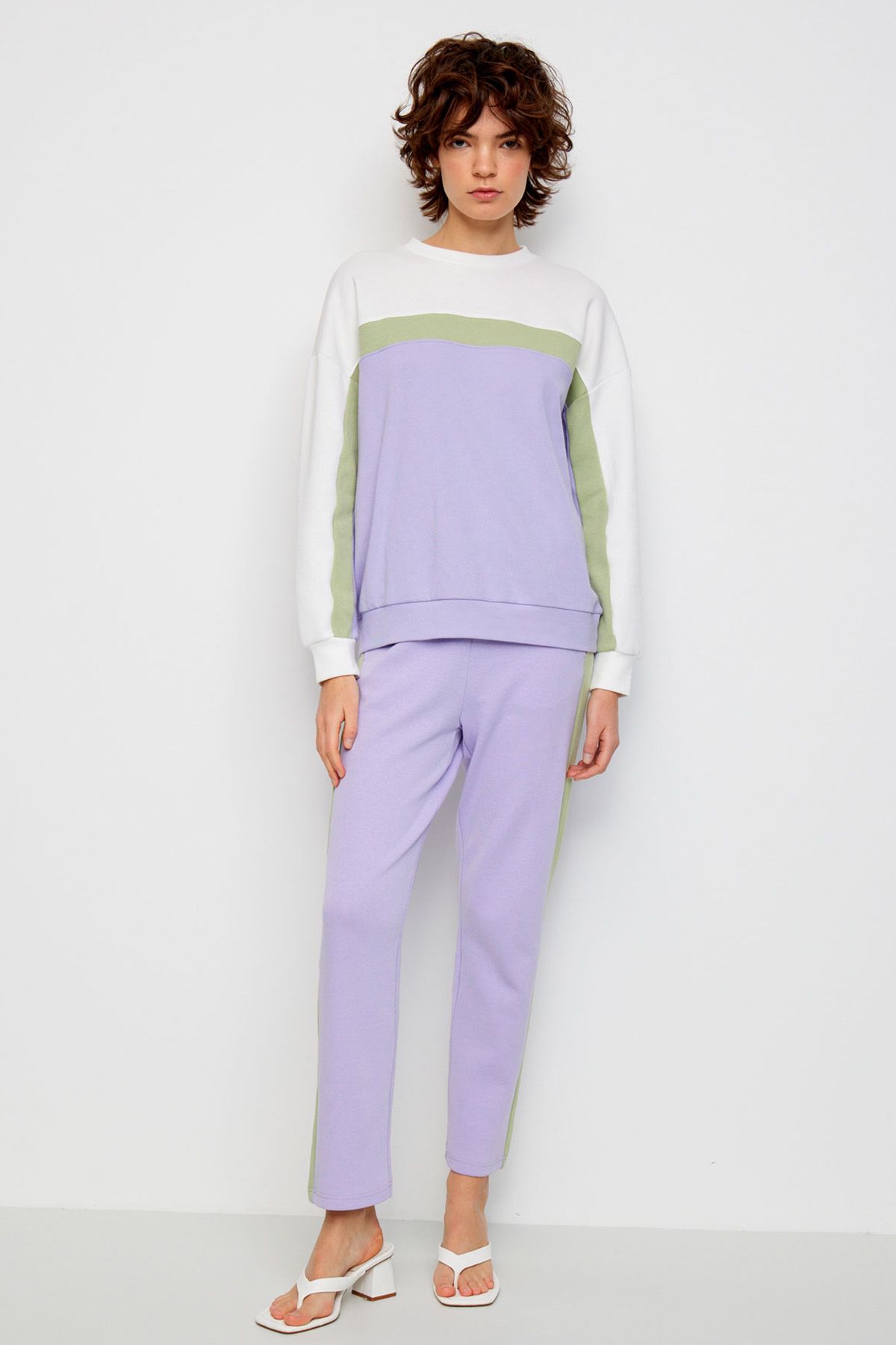 Прямые брюки, выполненные из мягкого и приятного к телу трикотажного полотна. В составе материала: хлопок и полиэстер, что обеспечивает практичность и долговечность изделия. Эластичная резинка обеспечивает комфортную посадку на талии. Брюки имеют высокую посадку, визуально удлиняющую ноги. Отличительной особенностью модели являются лампасы, расположенные на внешней части штанин, добавляющие образу динамичности. Предусмотрены удобные боковые карманы.